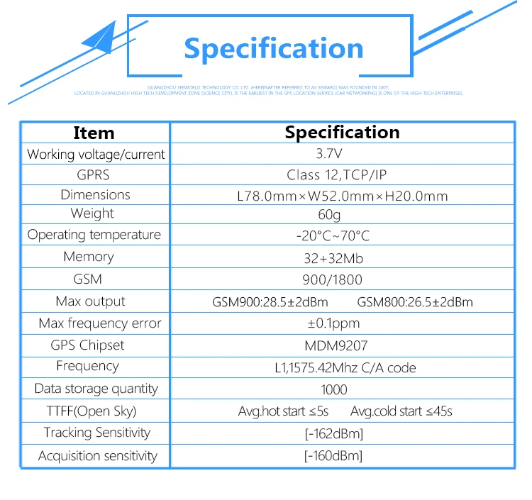 GSM: B1/B2/B3/B4/B5/B7/B8/B28 @ FDD LTE; B40 @ TDD LTE; B1/B2/B5/B8 @ WCDMA; B2/B3/B5/B8 @ GSM GPRS: класс 12, TCP/IP Время работы: 5 часов Спецификация чипа: MDM9207 Чувствительность отслеживания: '-162dBm Чувствительность к приобретению:-160 дБм Точность позиционирования: <5 метров Поддержка диапазона входного напряжения: 6-35 с Avg. Холодный старт ≤45с Рабочая температура:-20℃ ~ + 70℃ Количество хранения данных: 1000