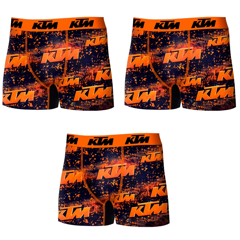Комплект из 3 трусов-боксеров с рисунком KTM черного цвета. Коллекция моделей мотоциклов Состав робота 92% полиэстер и 8% эластан Робот подходит для занятий спортом. Робот не растягивается и не разворачивается. Робот с двойным вкладышем частично из интимных зон из хлопка. Робот обеспечивает максимальную эластичность и гладкость. Резиновая резинка на поясе эластичная, прочная и не скользит. Подходит для сушки до 40 °C Быстрая сушка и не требует глажки.