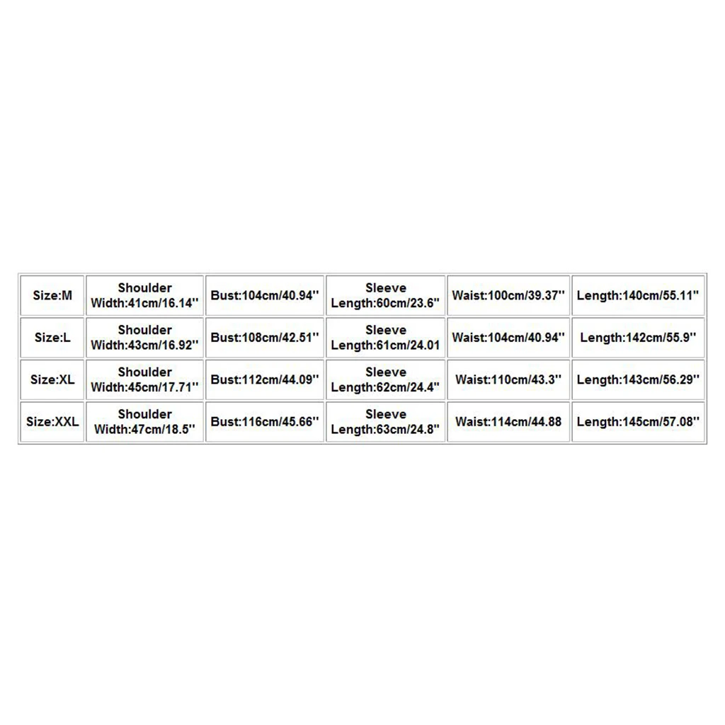 | Размеры: XL | Ширина плеч: 45 см/17,71 дюйма | Бюст: 112 см/44,09 дюйма | Длина рукава: 62 см/24,4 дюйма | Эластичная резинка на талии: 110 см/43,3'' | Длина: 143 см/56,29'' |