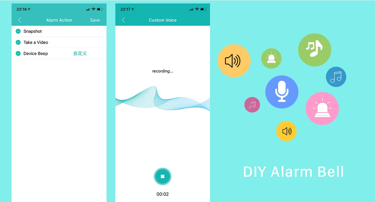 Поддержка колокольчика по умолчанию или DIY 3 секунды пользовательский колокольчик с вашим голосом. Когда вы выходите, не принося телефон и кого-то близко к вашему дому, сигнал тревоги DIY может дать мужчинам понять, что вы смотрите на него сейчас.