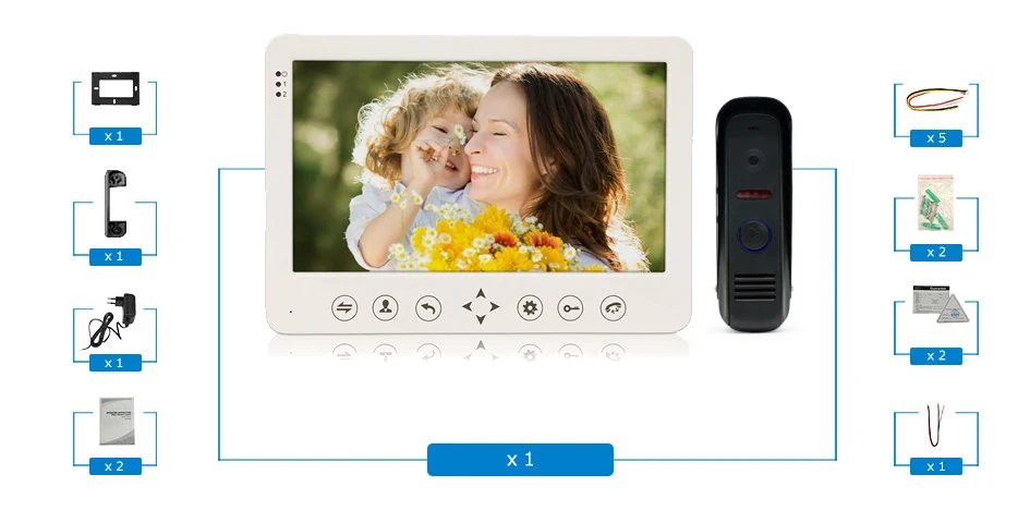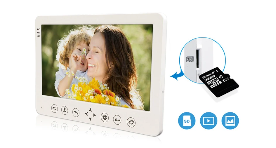 Отличная производительность ♦ 10,1 "TFT цветной экран с высоким разрешением ♦ Супер тонкий дизайн ♦Touch кнопка ♦Room в комнату домофон ♦ Ответ на дверь, мониторинг и разблокировка ♦Регулируемый цвет, яркость и громкость ♦ Встроенная память может сохранить 86 фотографий, поддержка внешних Макс. 32 Гб sd-карты