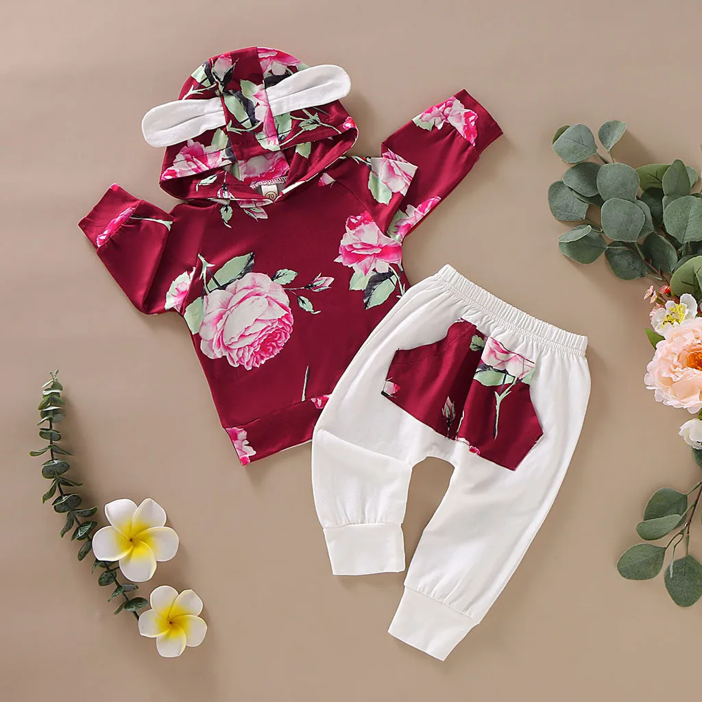 Толстовка с цветочным принтом для новорожденных мальчиков и девочек, футболка, топы с карманами, комплект со штанами