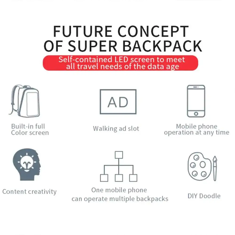 1. Умный светодиодный рюкзак: Раскройте свой творческий потенциал, используя светодиодный приложение Space. Мы обновили приложение на V2.0.0 в мая и улучшили многие функции. Это более удобно в использовании. Рюкзак может отображать текст, изображения, анимацию и граффити.