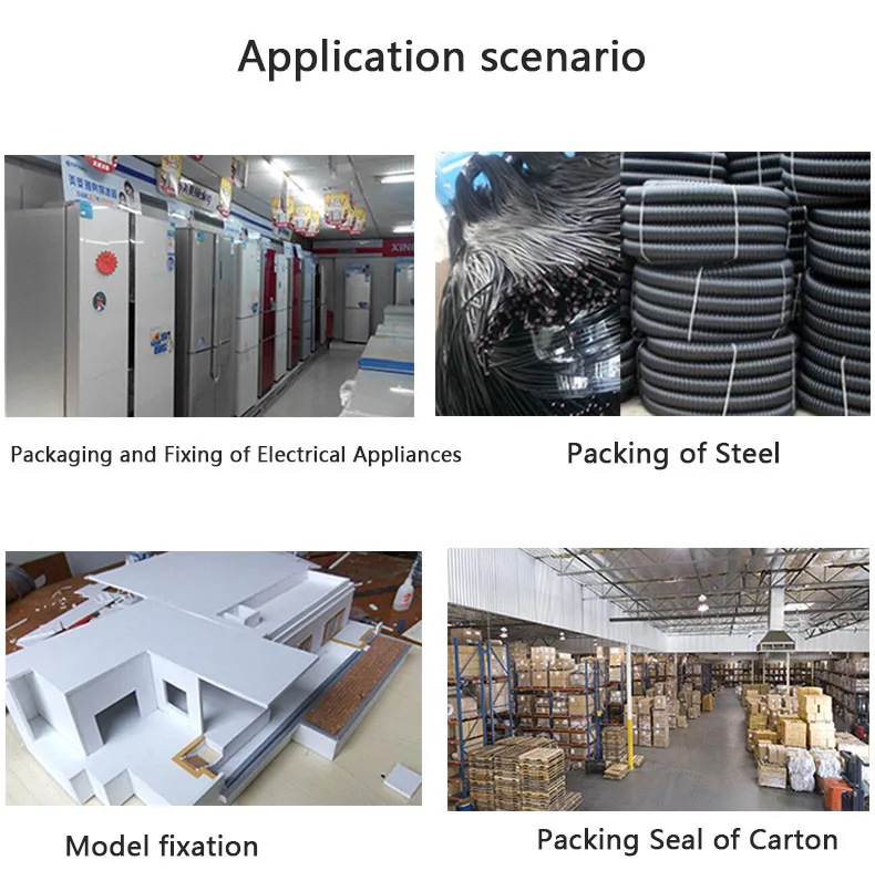 Прочная вязкость, легко отшелушивается, износостойкая, влагостойкая, анти-трещина Подходит для промышленности, игрушек, моделей самолетов, электроники, бытовой техники и других отраслей промышленности в герметизации, связывании, линии работы и других фиксированных. Такие как холодильники, компьютеры, факсимильные аппараты и тонкие стальные пластины и т. Д.