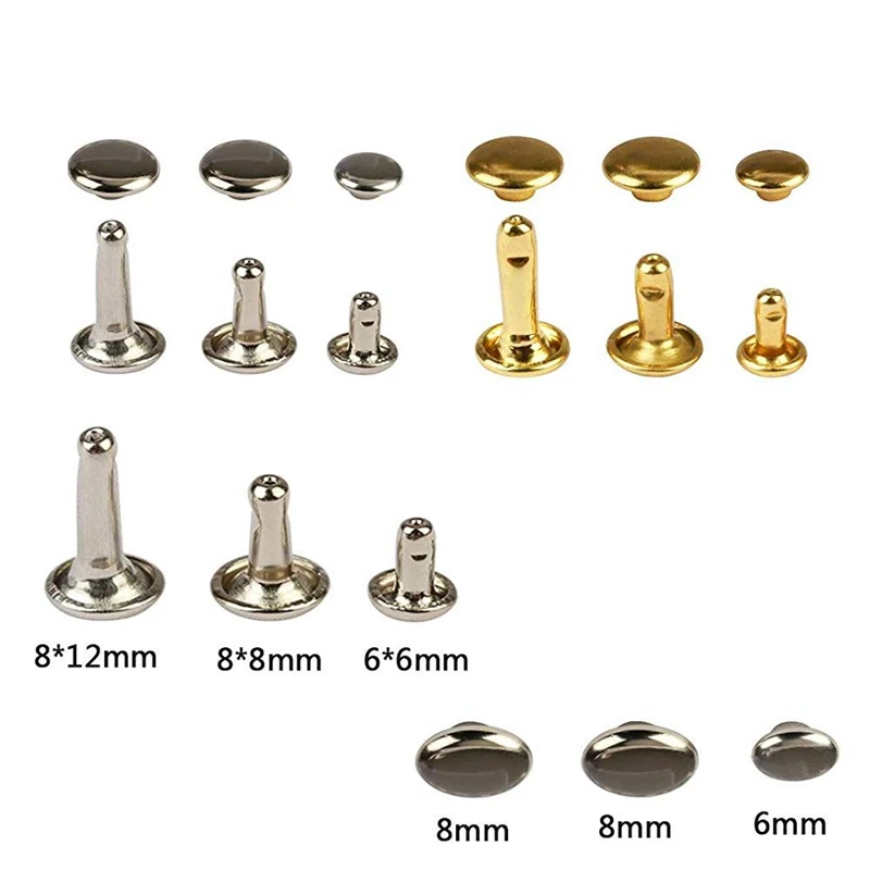 (Соответствует требованию) 300 комплектов заклепок с двойным колпачком доступны в 3 различных размерах: 6 мм x 6 мм, 8 мм x 8 мм, 8 мм x 12 мм, для кожи и ремесел различной толщины; 3 разных цвета для удовлетворения потребностей различных ремесел.
