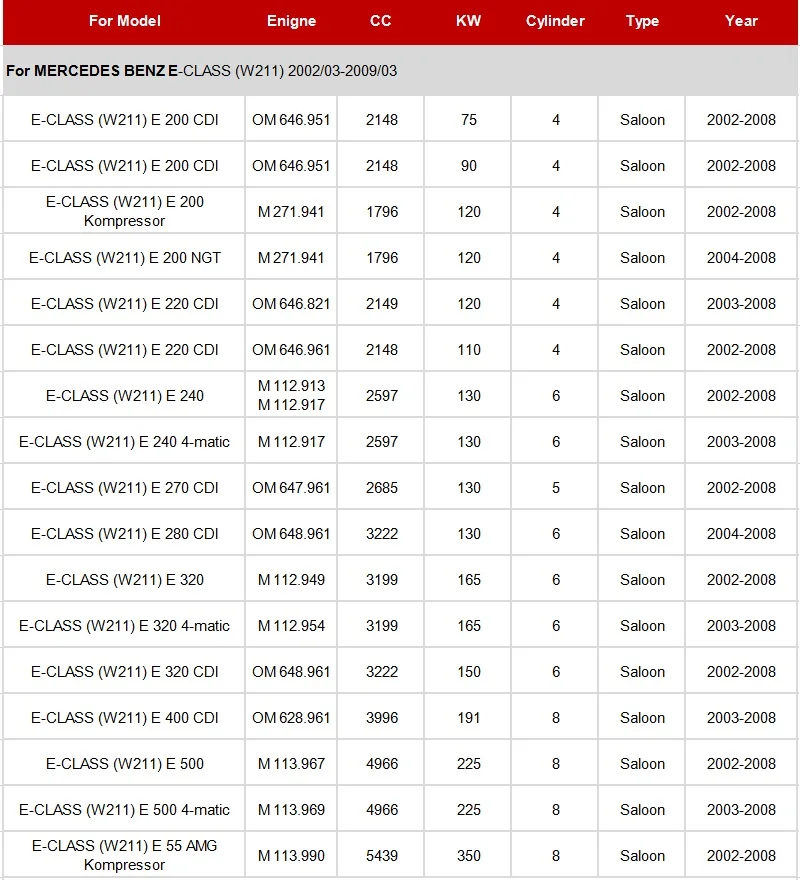 Для MERCEDES-BENZ E-CLASS (W211) E 220 CDI Saloon 2003-2008