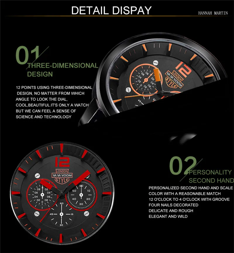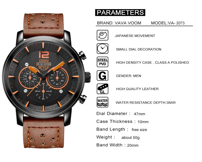 > Подробнее о продукте ● Бренд --------- VA VOOM ● Стиль часов ---------- модные и повседневные ● Механизм ---------- японский кварцевый механизм высокого качества ● Срок службы батареи ---------- более 3 лет ● Водонепроницаемый ----------- настоящий 30 м водонепроницаемый (вы можете плавать, дайвинг, мыть) ● Функция --- Водонепроницаемый ●Drop доставка --- Поддержка > Параметр продукта ● Длина ремешка ---------- около 25,5 см ● Диаметр циферблата ---------- около 47 мм ● Толщина циферблата --------- около 10 мм ● Ширина ремешка ---------- около 20 мм ● Вес ---------- около 50 г