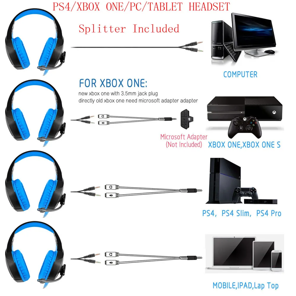 Введение продукта 1. Высококачественное звуковое производство обеспечивает высокое, среднее и низкое качество звука; 2. Белковый наушник для кожи, Защита окружающей среды, износостойкий и удобный для ношения; 3. Светильник с весовым дизайном, саморегулирующийся дизайн головного света, лучший игровой опыт; 4. Светодиодный ослепляющий светильник; 5. Высокочувствительный микрофон обеспечивает более точный, четкий и плавный голос; 6. Кнопка регулировки громкости; 7. Кнопка включения микрофона; 8.3.5 мм зеленый разъем для гарнитуры, красный разъем для микрофона; 9. Usb-интерфейс для источника питания для Светодиодный свет; Параметры продукта Размер динамика: 50 мм Сопротивление микрофона: 2.2KΩ Сопротивление: 20 Ом +/-15% Направленность: всенаправленный Чувствительность: 117 +/-3 дБ Кабель Длина: 2,2 m +/-0,15 м Частотный диапазон: 20 Гц-20 кГц Светодиодный Рабочее напряжение: 5 в пост. Тока +/-5% Микрофон: 6,0*2,7 мм Рабочий ток:<100 мА Чувствительность микрофона:-36 +/-1 дБ Разъем для подключения гарнитуры: USB + 3,5 мм Посылка Игровые гарнитуры для геймпада PS4/Xbox One-1 шт. 1 х сплиттер кабель 1 x Руководство пользователя Настройка PS4: 1. Прежде чем применять гарнитуру на PS4, пожалуйста, проверьте ее с помощью своего мобильного телефона, чтобы убедиться, что она хорошо работает. 2. Вставьте гарнитура собственный 3,5 мм штекер в геймпад, затем нажмите и удерживайте кнопку PS или войти в Системных настройках. 3. Есть периферийные устройства, выберите «настроить звук и устройства», «выход на наушники», затем измените его на «все аудио». Вопросы и внимание: О: Пожалуйста, наслаждайтесь музыкой при измеряемой громкости, чтобы предотвратить отрицательные эффекты на слуху; B: пожалуйста, будьте осторожны, чтобы носить во время езды на велосипеде, чтобы не повлиять на безопасность; C: характеристики продукта могут быть изменены без какого-либо уведомления; D: если разобрать гарнитуру без разрешения, мы не можем гарантировать качество;
