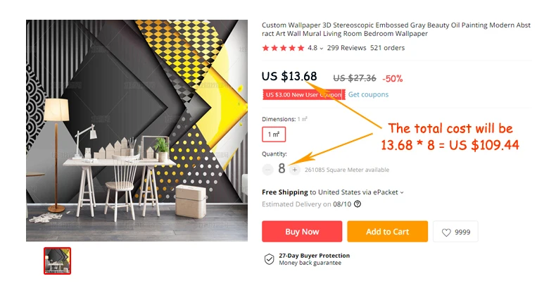 Цена указана только за 1 м². Например, цена shoween составляет $13,68, и вы Требуется 8 м², общая стоимость будет 13,68*8 = $109,44