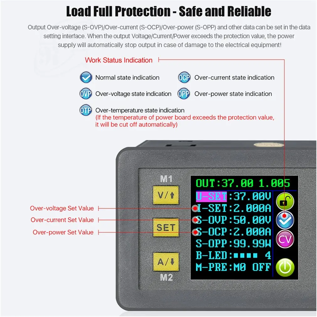 2. С 6 значками бегущего состояния и блокировкой клавиш, предустановленным выходным напряжением/током (в двух местах, по V, кнопке и кнопке), установите по умолчанию загрузочный выход открытым или закрытым.