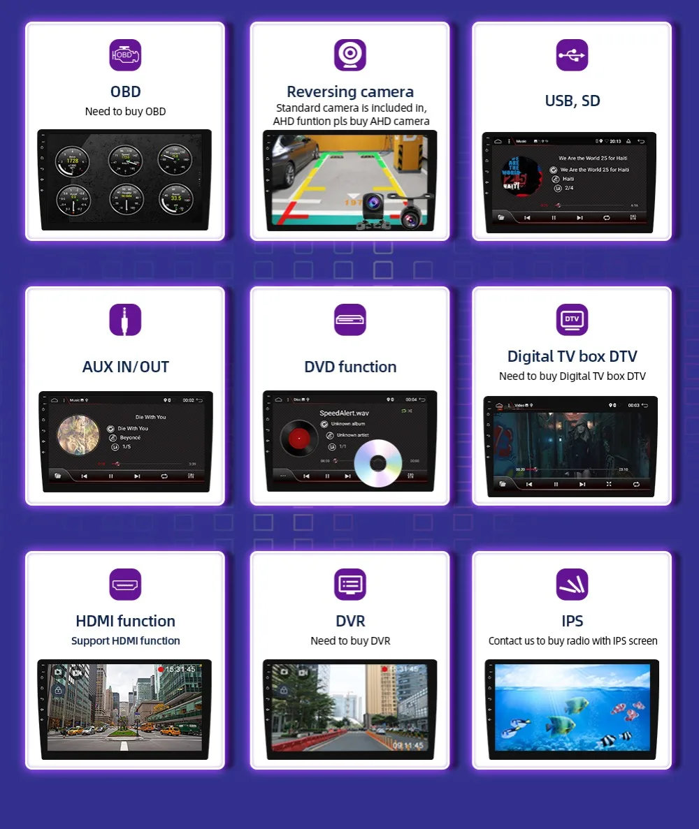 Стандарт: радио тюнер/RDS /FM/gps-навигация/Wifi /Bluetooth/Управление рулевым колесом/сплит-экран/USB /SD/сенсорный экран/1024*600/Зеркальное соединение/HDMI порт/вид сзади камера/карта/сабвуфер/DVD /CD проигрыватель (некоторые элементы не sup port) вариант: OBD2 /DAB + /DVR /3G /4G /TV Box /TPMS