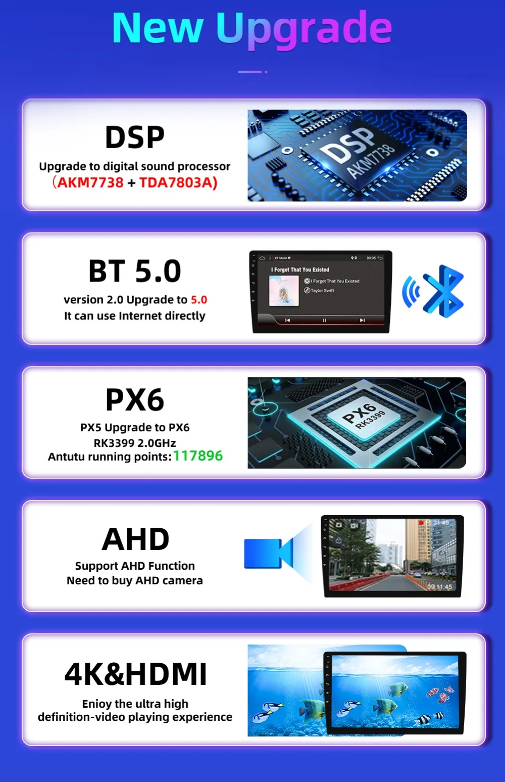 1.CPU: PX6 Cortex A72 + A53, Android 10,0, RAM-4G,ROM-64G, 2,0 ГГц,