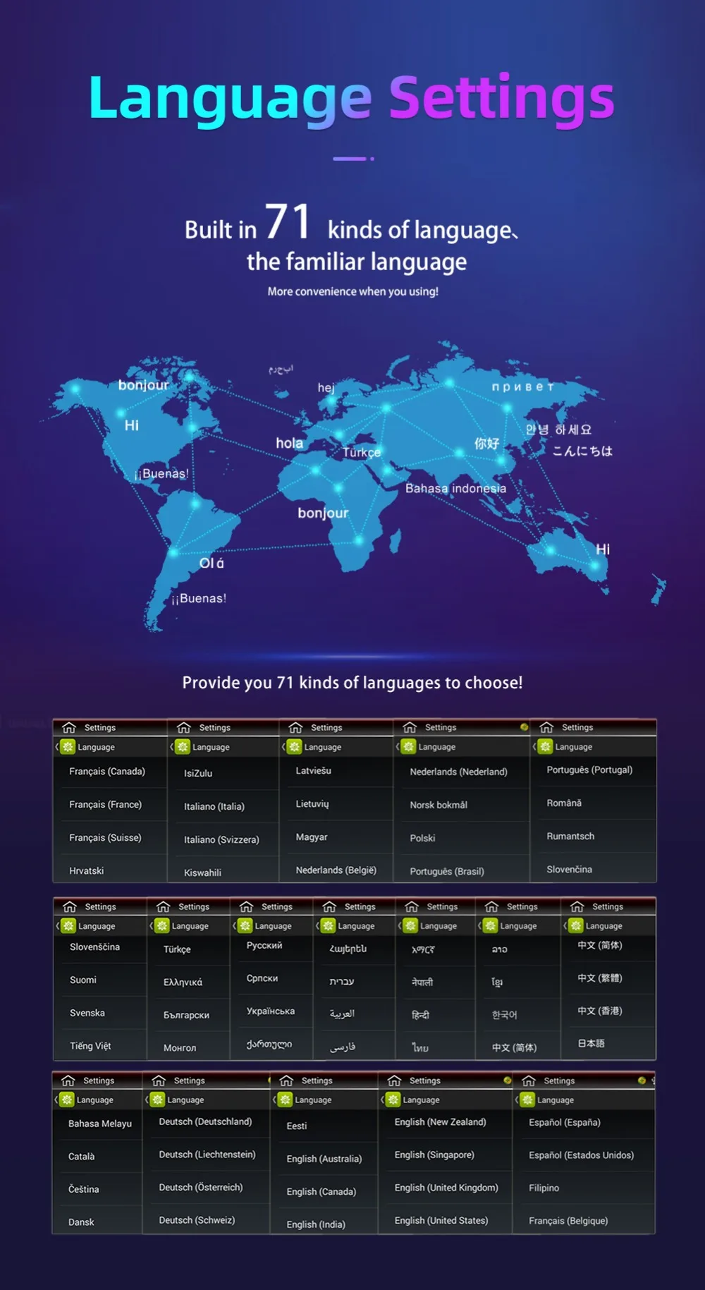 12: мульти OSD Languaes: английский/русский/французский/немецкий/испанский/итальянский/арабский/Португальский/Турецкий/тайский/Польский/иврит и т. д. 60 видов языка