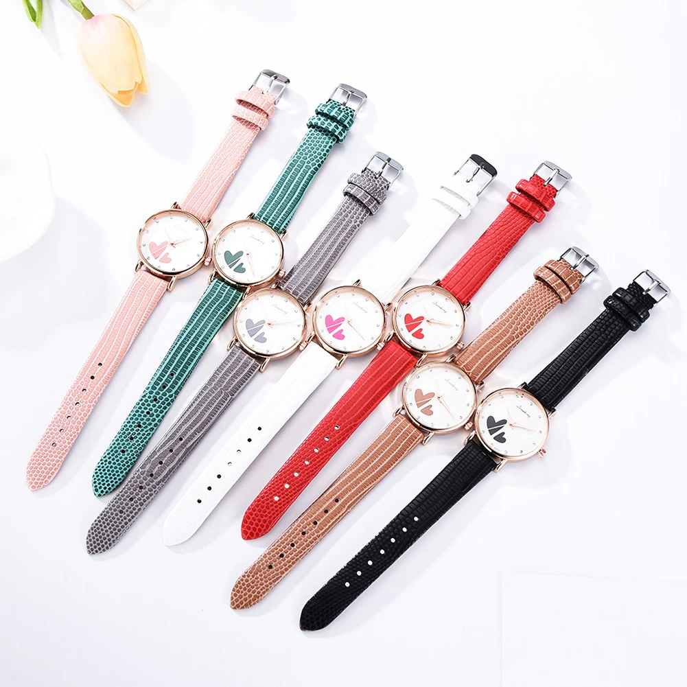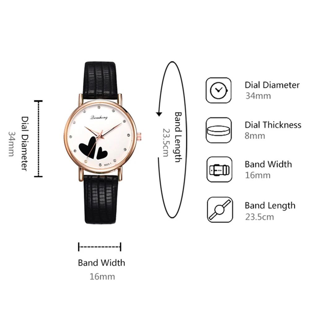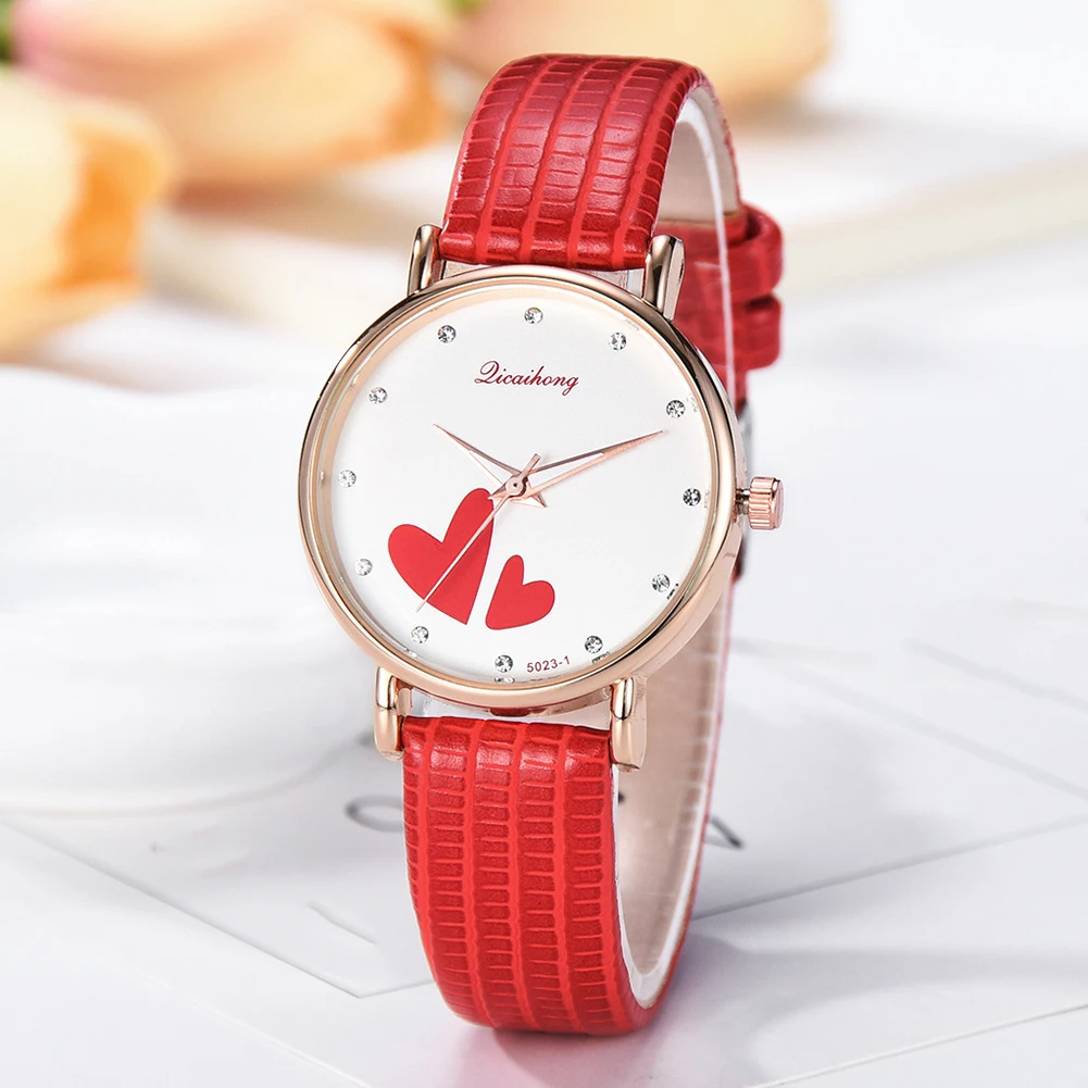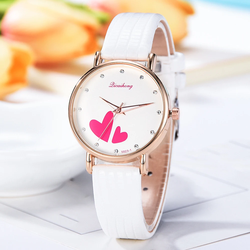 Двойное сердце со стразами круглый циферблат искусственная кожа ремешок Женские кварцевые наручные часы