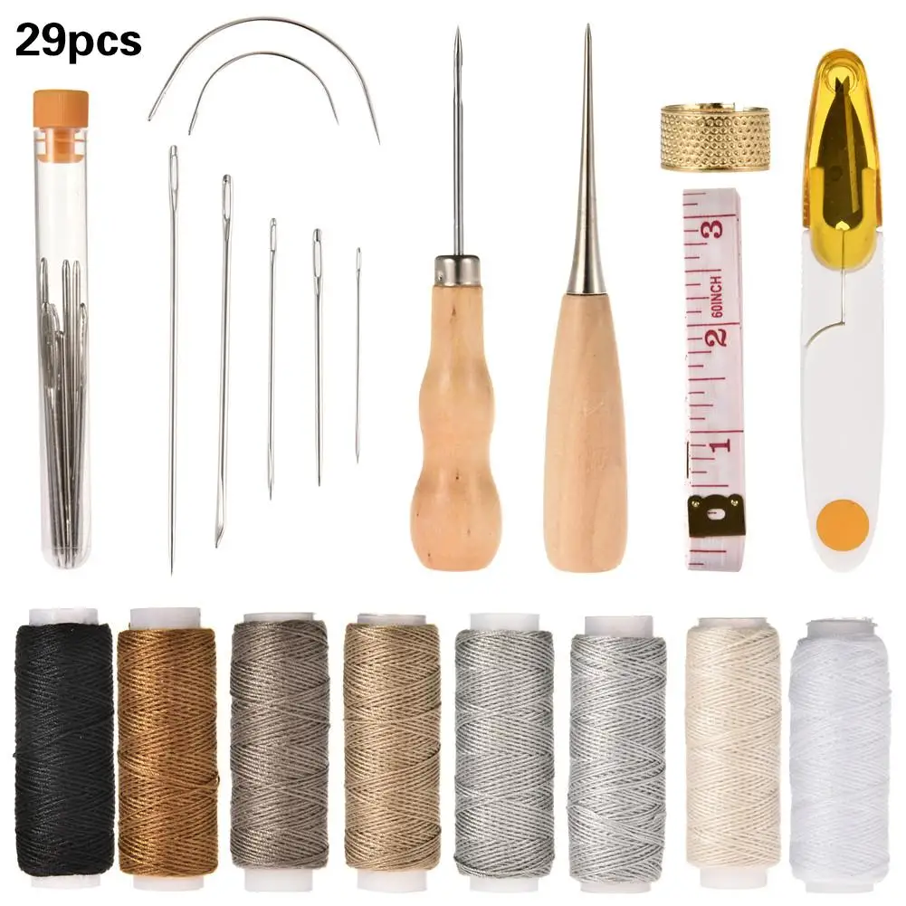 1. 29 предметов: Набор для ремонта содержит 9 кожаных строчек, 8 внутренних отделочных нитей, 7 кожаных швейных игл, 1 Шипованный конус, 1 конус крючка, 1 рулетка, 1 прошивка наперсток и 1 пряжа для удовлетворения ваших потребностей.