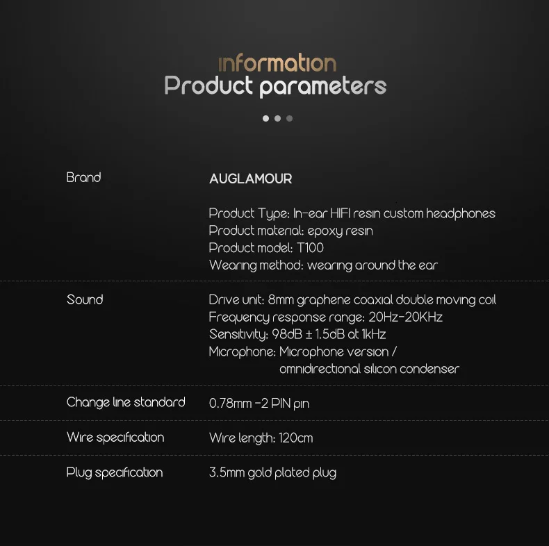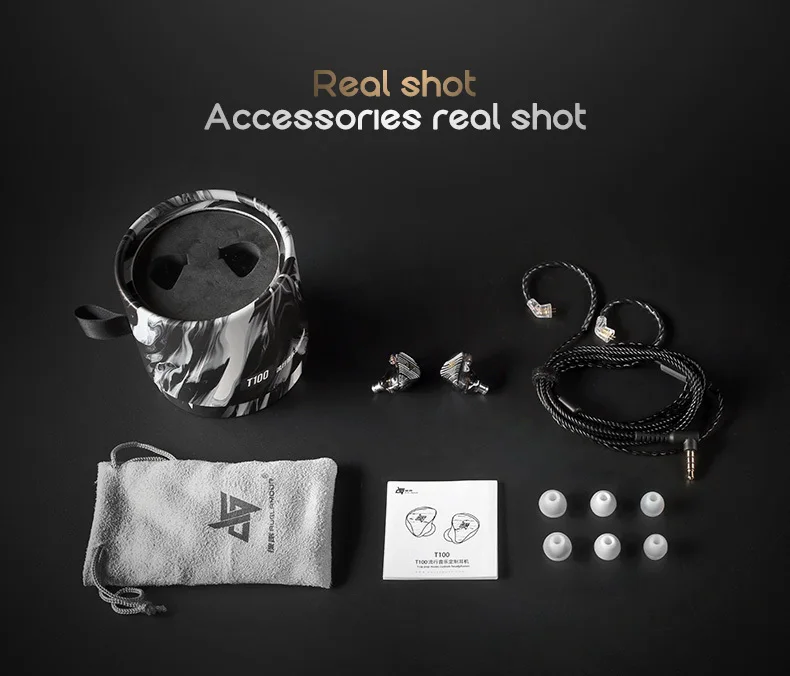 Спецификация: 1. Название продукта: AUGLAMOUR T100 2. Бренд: AUGLAMOUR 3. Модель: T100 4. Тип наушников: Гибридный 5. Сопротивление: 19 Ω 6. Чувствительность наушников: 98 дБ 7. Частотный диапазон отклика: 20-20000 Гц 8. Тип разъема: 3,5 мм прямой 9. Длина кабеля: 1,2 м ± 3 см 10.Цвет: черный 11. Есть ли кабель: Да 12. Разъем для наушников: 2pin 0,78 мм разъем 13. С микрофоном: Да 14. Можно ли заменить кабель: Да