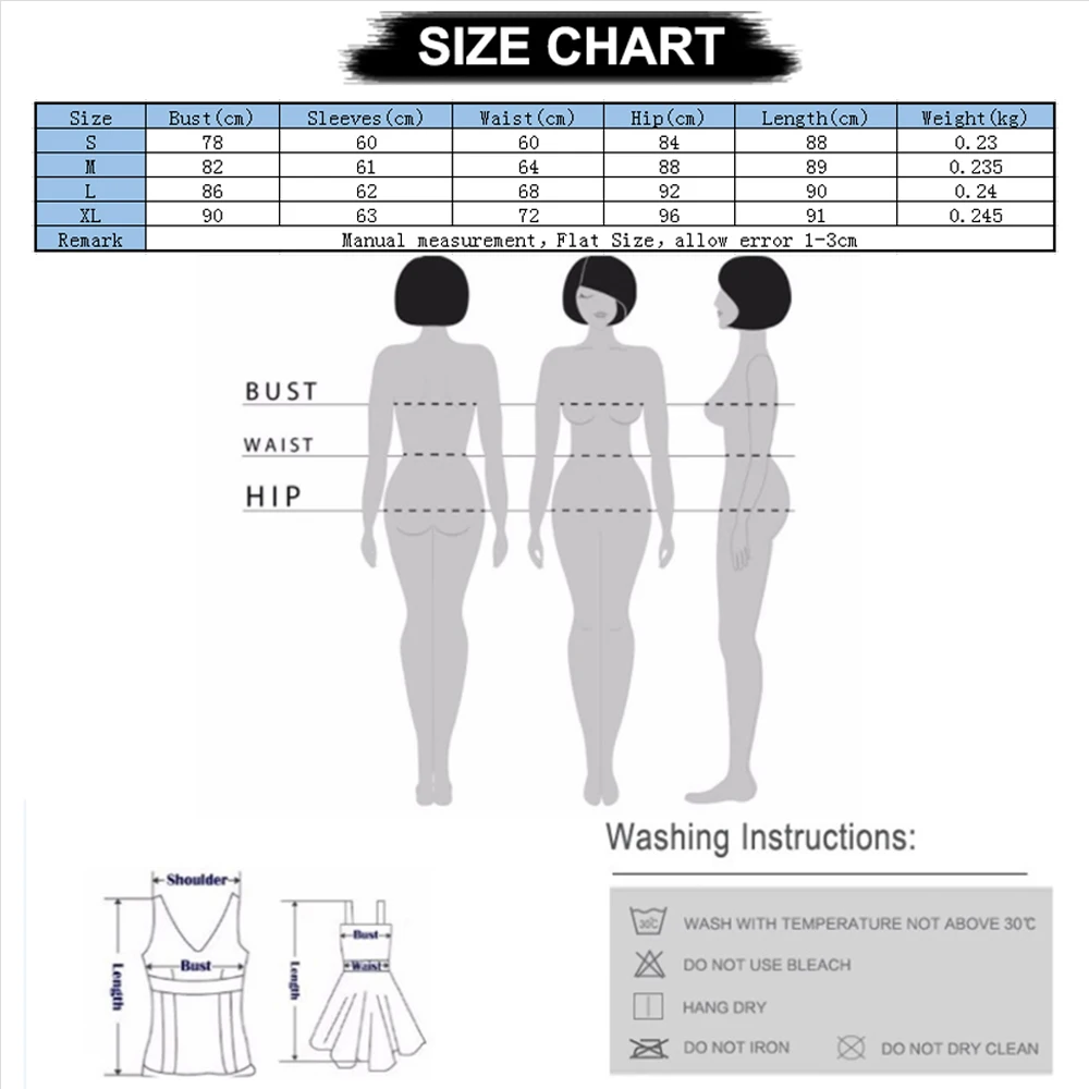 S Обхват груди: 78 см, длина рукава: 60 см, обхват талии: 60 см, обхват бедер: 84 см, длина платья: 88 см M Обхват груди: 82 см, длина рукава: 61 см, обхват талии: 64 см, обхват бедер: 88 см, длина платья: 89 см L Обхват груди: 86 см, длина рукава: 62 см, обхват талии: 68 см, обхват бедер: 92 см, длина платья: 90 см XL Обхват груди: 90 см, длина рукава: 63 см, обхват талии: 72 см, обхват бедер: 96 см, длина платья: 91 см