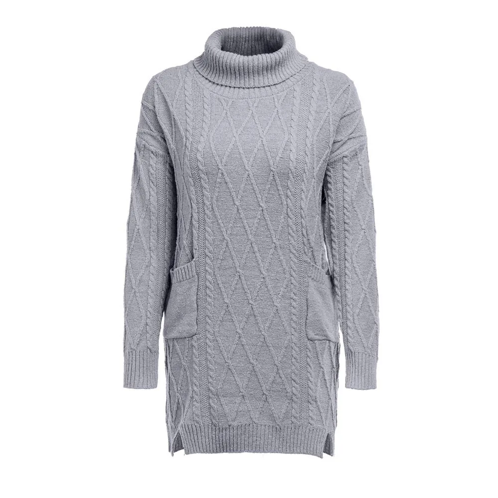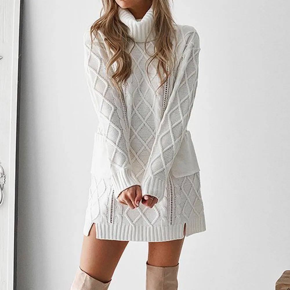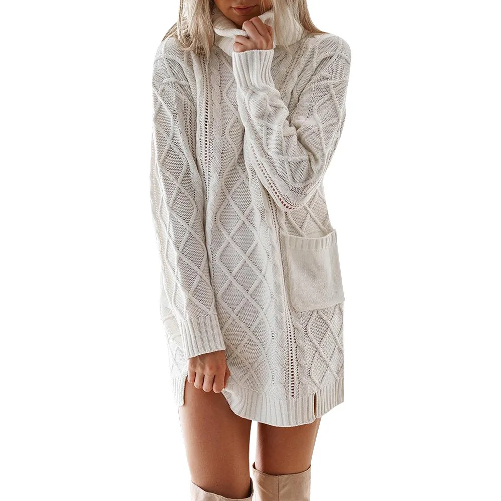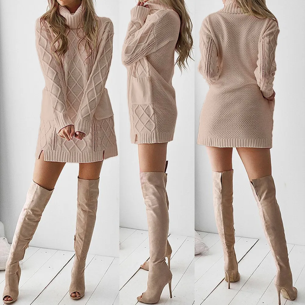 Женский зимний свитер, вязаная водолазка, теплое платье с длинным рукавом и карманом, сексуальное мини-платье