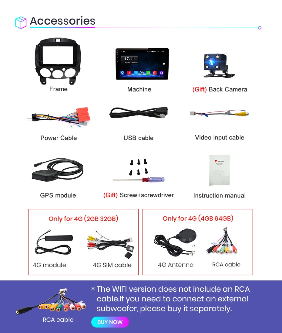1). The device need to search satellite success first time, then it will update time, 2). Please understand that the system and preinstalled apps will take part memory; if install Russia map will take about 3GB; if install Europe map, system will take about 7GB; 1. Why do you have such low prices in your store? We have our own factory in China, and the main parts; We manufacture devices (for example, a screen and a head unit, etc.) in our factory. Thus, the cost of products is lower than that of other company. The other and most important reason for the low price is our desire to please Car DVD buyers. 2. What is the difference between WiFi and 4G version? The device have navigator, play music, help park function, etc.However, in order to connect the radio to the Internet, you will need to use your smartphone as a modem. Therefore, for those car owners who actively use the Internet when traveling, we recommend purchasing a device with 4G. Since if all the time keep the phone in modem mode, it will quickly discharge. 3.If you do not like the product, is it possible to return? If you are not really satisfied with the purchase, you can return the goods. Send it to our warehouse in Russia/Spain/China; As for the refund, if it will be impossible to return the money through Aliexpress, we will return it to you on the card. Do not worry, we value our reputation very much and therefore we try to provide the best possible service to our customers. 4.How to set up the steering wheel controls >1G+16G/2G+32G WIFI version Setting--car infotainment--SWC--click clearall first ---then click the icons,When it flashes, press the button on the steering wheel to match the icon. After learning successful, it will change color >4G+64G version Setting-genaral--steering wheel setting Please press the button on the steering wheel, and at the same time click the button on the screen to match, it will change color after matching. Note:If your order comes with canbus ,please go to set up the canbus type ,then the button can work,please contact our customer service for help. 5.How to connect the rear camera ? 1)Red cable ① is connected to the backup light "+" 2) black cable ② is connected to the backup light "-" 3)The reversing detection cable ④(Brown color) is connected to the red cable ③ which extending from the video input cable 4) ⑤ cable does not need to be connected