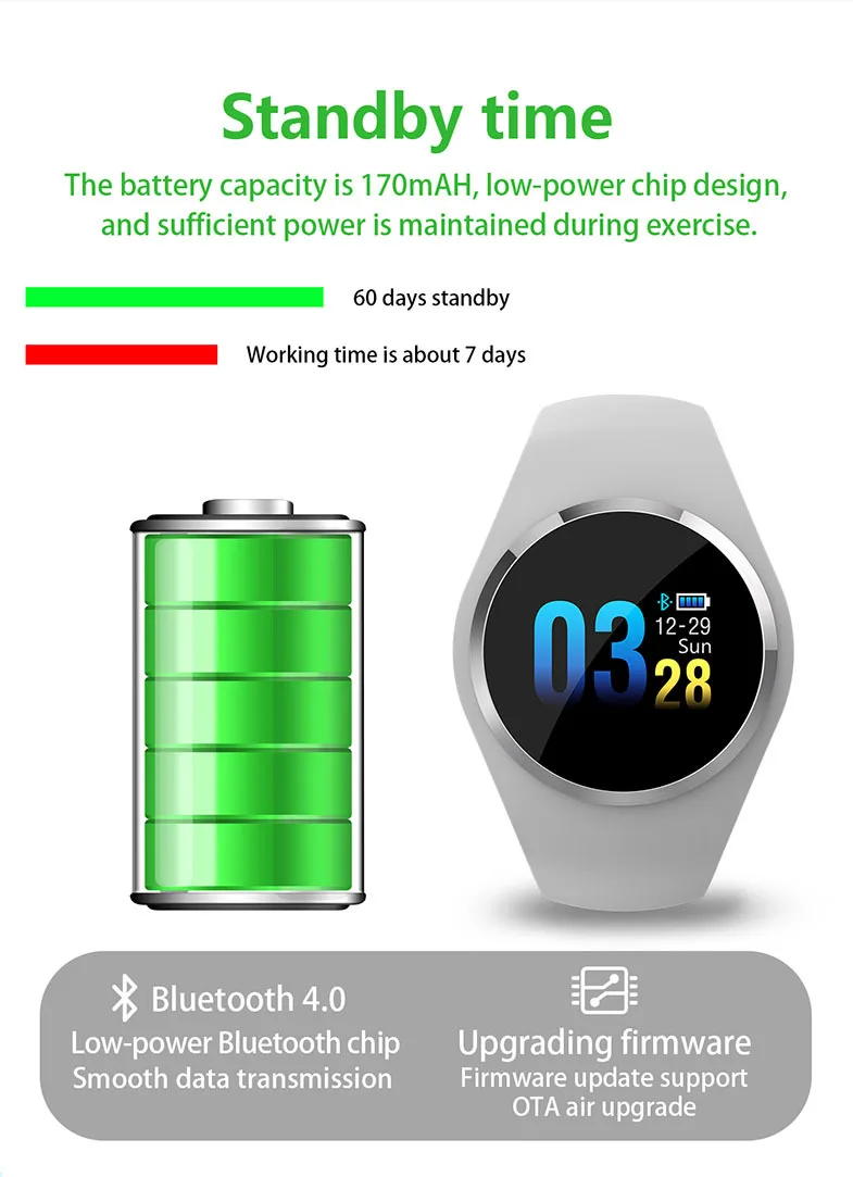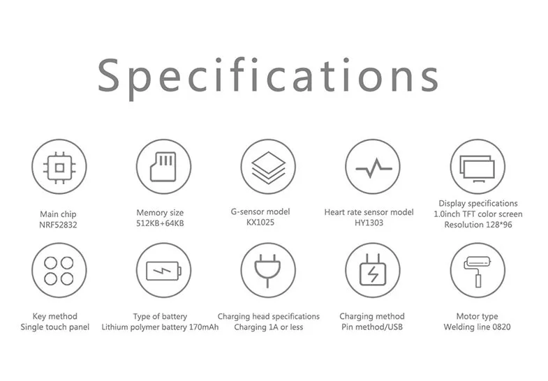 Основные характеристики: * Чипсет NRF52832_QFAA, хранилище 512KB + 64KB * 1,0 дюймов TFT ЖК-дисплей Разрешение: 128*96 сенсорный Панель * IP67 водонепроницаемый (не носить для плавания или дайвинга, или положить его в горячую воду) * Встроенный полимерный литиевый аккумулятор емкостью 170 мА · ч, обычно используется 7 дней; 60 дней в режиме ожидания (на основе) * Поддержка измерения пульса в режиме реального времени (статическое, динамическое)/кровяное давление (можно установить замеры артериального давления) * Напоминание о звонках и сообщения push (SMS/QQ/Wechat/Skype/Facebook/Twitter/Line/WhatsApp) * Спортивная запись: шаги, время спорта, расстояние, калории (данные о спорте и сне в течение 30 дней сохранены) * Название приложения: "H Band" * BLE 4,0, для Android 4,3 и iOS-iPhone 4S и выше * Дополнительные функции: монитор сна, монитор усталости, напоминание о тревоге, напоминание о напитке, напоминание о сидячем положении, защита от потери, поднятие до пробуждения, время, удаленная камера, режим DND, поиск диапазона, wetchat движение, отклонить вызов на смарт-браслет, OTA * Языки приложения: упрощенный китайский, традиционный китайский, английский, японский, корейский, испанский, немецкий, итальянский, французский, греческий, турецкий, русский, голландский, португальский Примечание: -- Носимые устройства отслеживают активность человека с помощью электронных датчиков, и они находятся на уровне электуоники потребителя. Это нормально для определенного отклонения. Пользователь должен рассматривать данные объективно. Пожалуйста, не сравнивайте с больничным оборудованием для чтения, это не медицинское устройство!