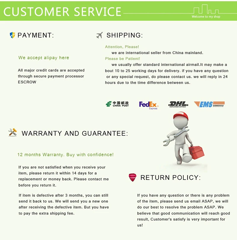 Пожалуйста, убедитесь, что ваш адрес в Aliexpress совпадает с вашим адресом доставки перед оплатой. Мы не несем ответственности за невозможность доставки. Мы оставляем за собой право снова взимать плату за доставку возвращенных товаров Из-за неправильного адреса. (И российский покупатель, пожалуйста, оставьте нам ваше полное имя, что очень важно, спасибо.) пожалуйста, обратите внимание и отметьте свой номер телефона на оплате, это поможет получить ваш продукт безопасно и Быстро.