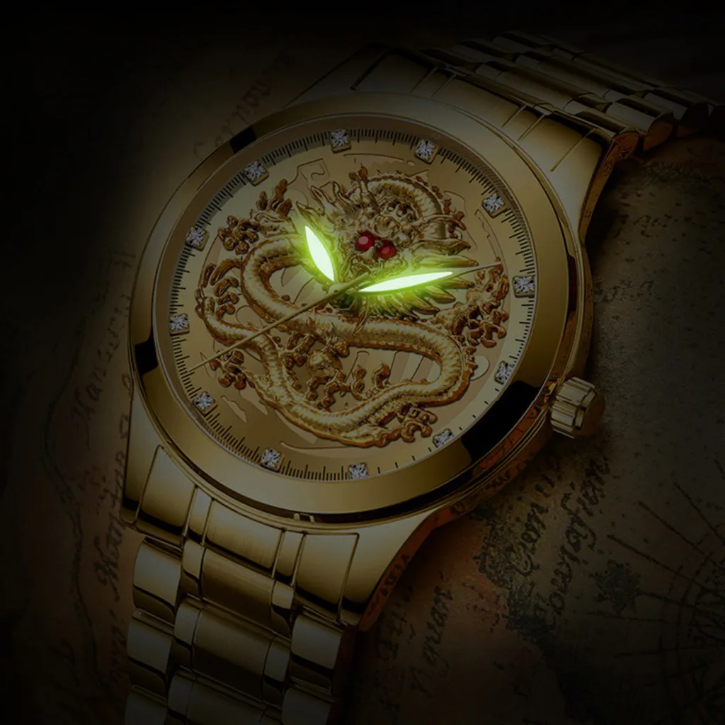 Роскошные мужские часы, водонепроницаемые часы из нержавеющей стали с тисненым бриллиантом и драконом, мужские кварцевые часы, деловые наручные часы, 2019