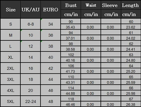 Размер::4XL | Евро::46 | Великобритания/Австралия::20 | Бюст (см/дюйм)::114/44.9 | Длина (см/дюйм)::66/26 |