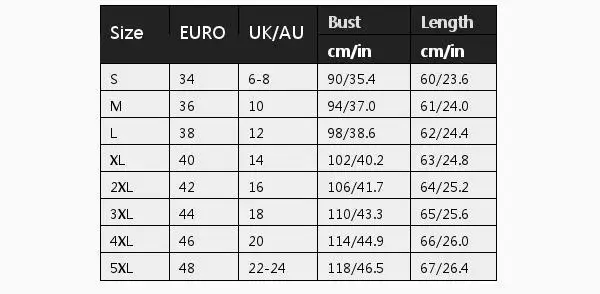 Размер::5XL | Евро::48 | Великобритания/Австралия::22-24 | Бюст (см/дюйм)::118/46.5 | Длина (см/дюйм)::67/26.4 |