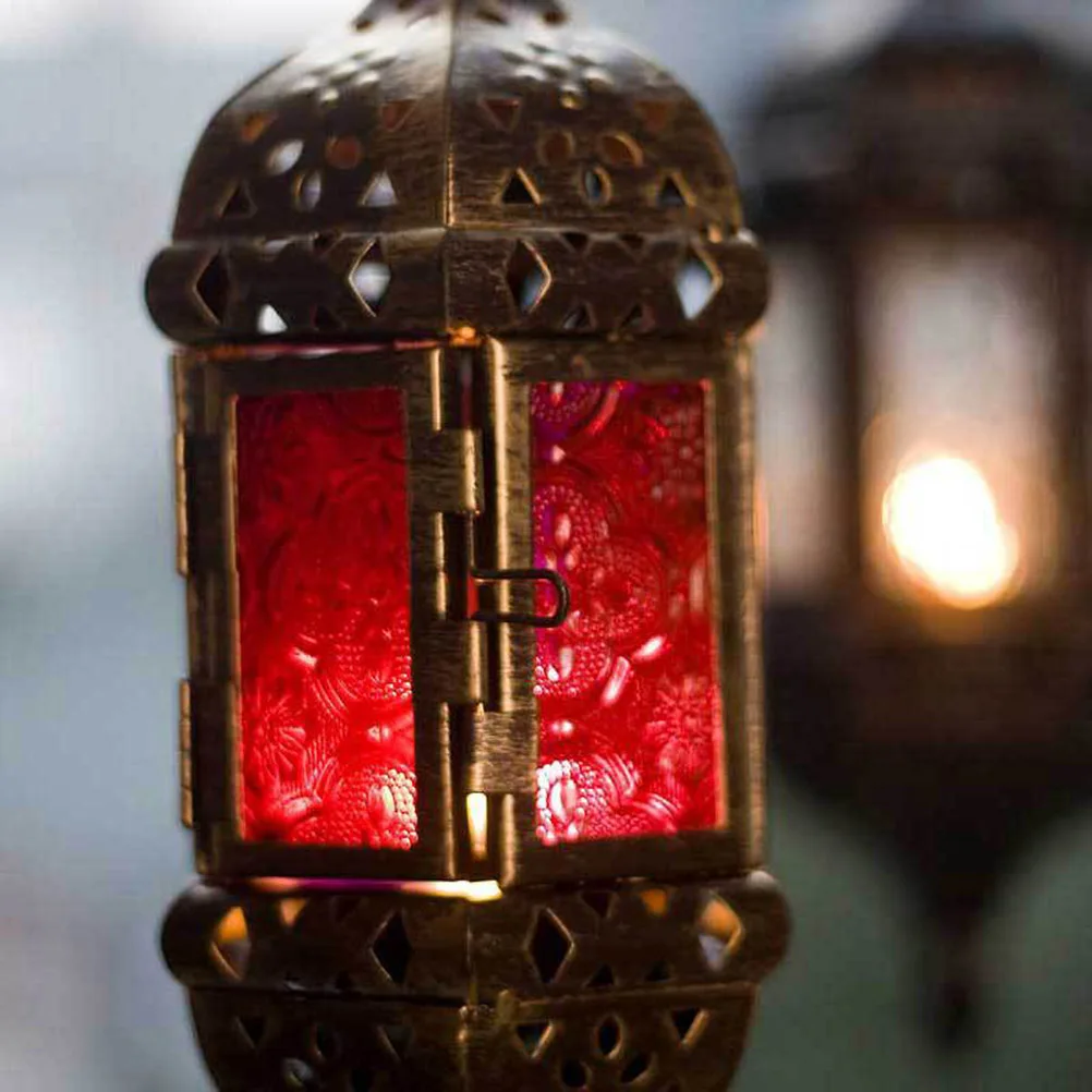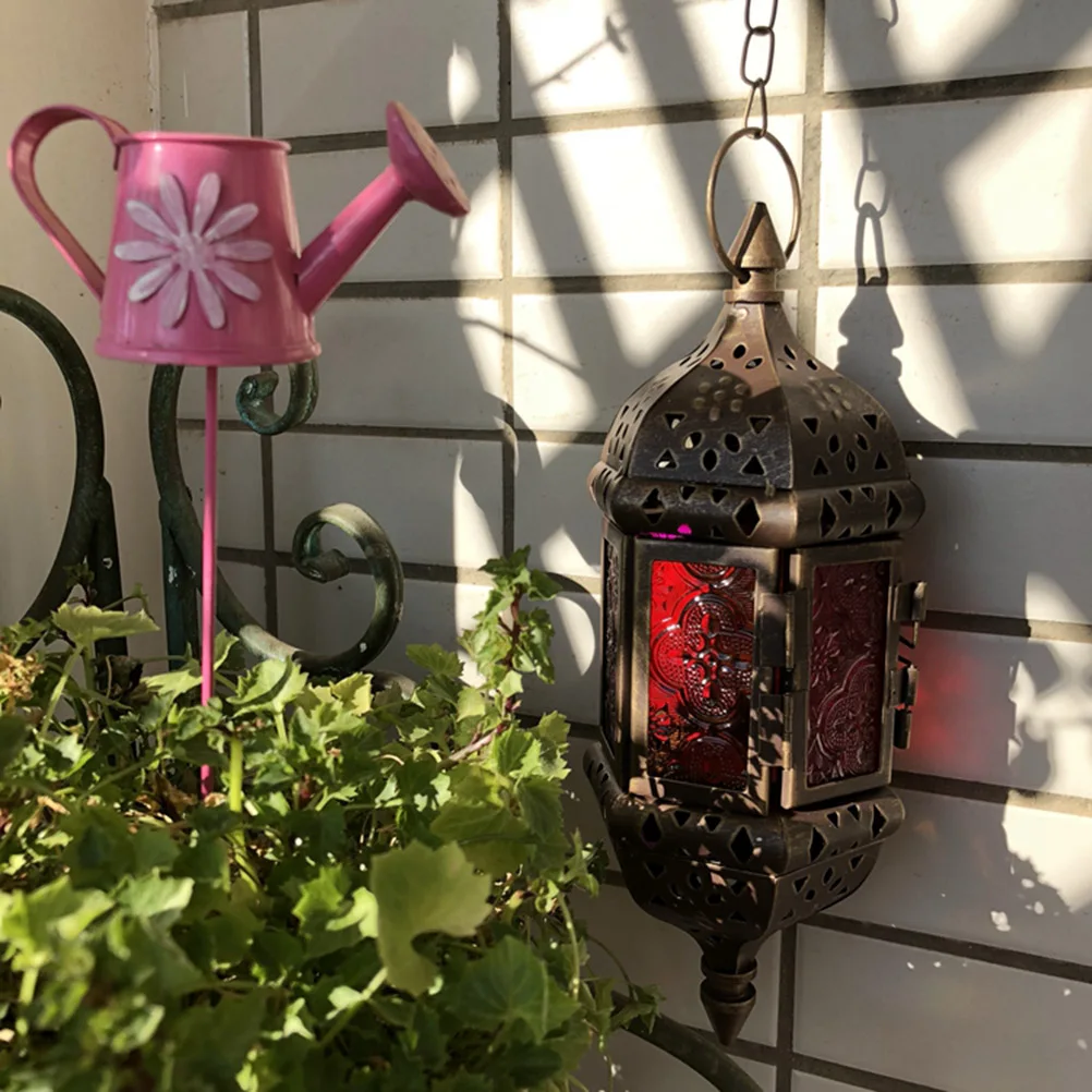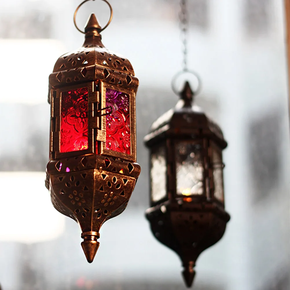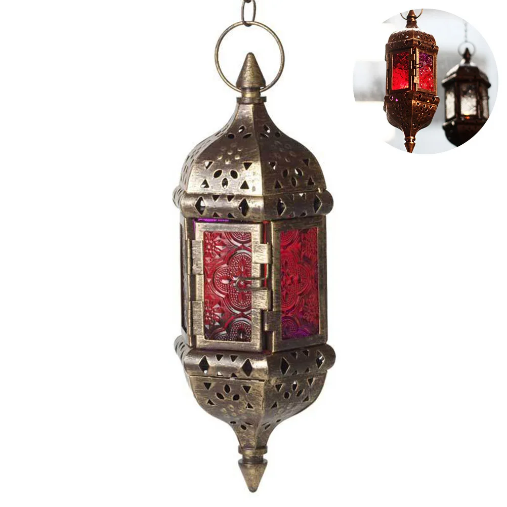 Винтажный морокканский подсвечник, 6 рельефных стекол и полый металлический каркас, добавляя цвет и экзотическую атмосферу, с уникальными узорами в любом пространстве.