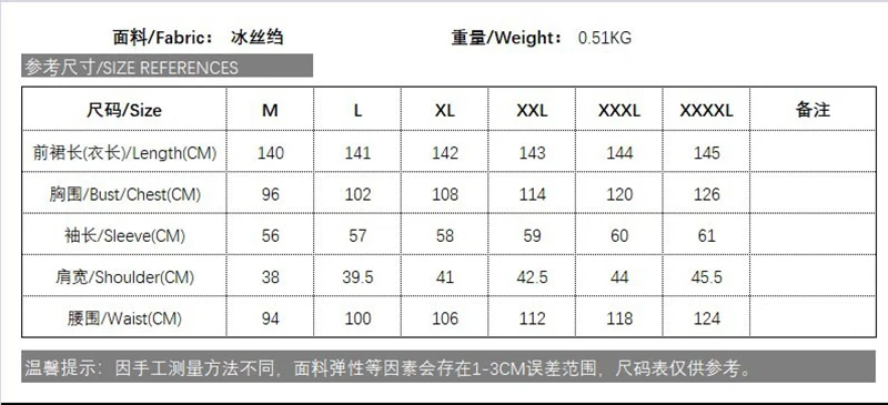 Размеры таблицы (единица измерения: 1 дюйм = 2,54 см M: плечо 38 см, обхват груди-96 см, обхват талии-94 см, длина рукава 56 см, Длина 140 см L: Плечо 39 см, обхват груди 102 см, обхват талии 100 см, рукав 57 см, Длина 141 см XL: плечо 41 см, обхват груди 108 см, обхват талии 106 см, Рукав 58 см, Длина 142 см 2XL: 42 см, обхват груди 114 см, обхват талии 112 см, рукав 59 см, Длина 143 см 3XL: плеча 44 см, обхват груди 120 см, обхват талии 118 см, рукав 60 см, Длина 144 см 4XL: 45 см, обхват груди 126 см, обхват талии 124 см, рукав 61 см, Длина 145 см