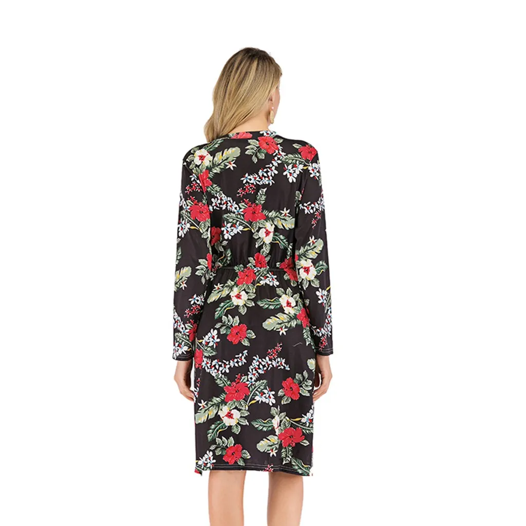 Women Casual Long Sleeve Floral Printed Midi Work Casual Dress With Pocket