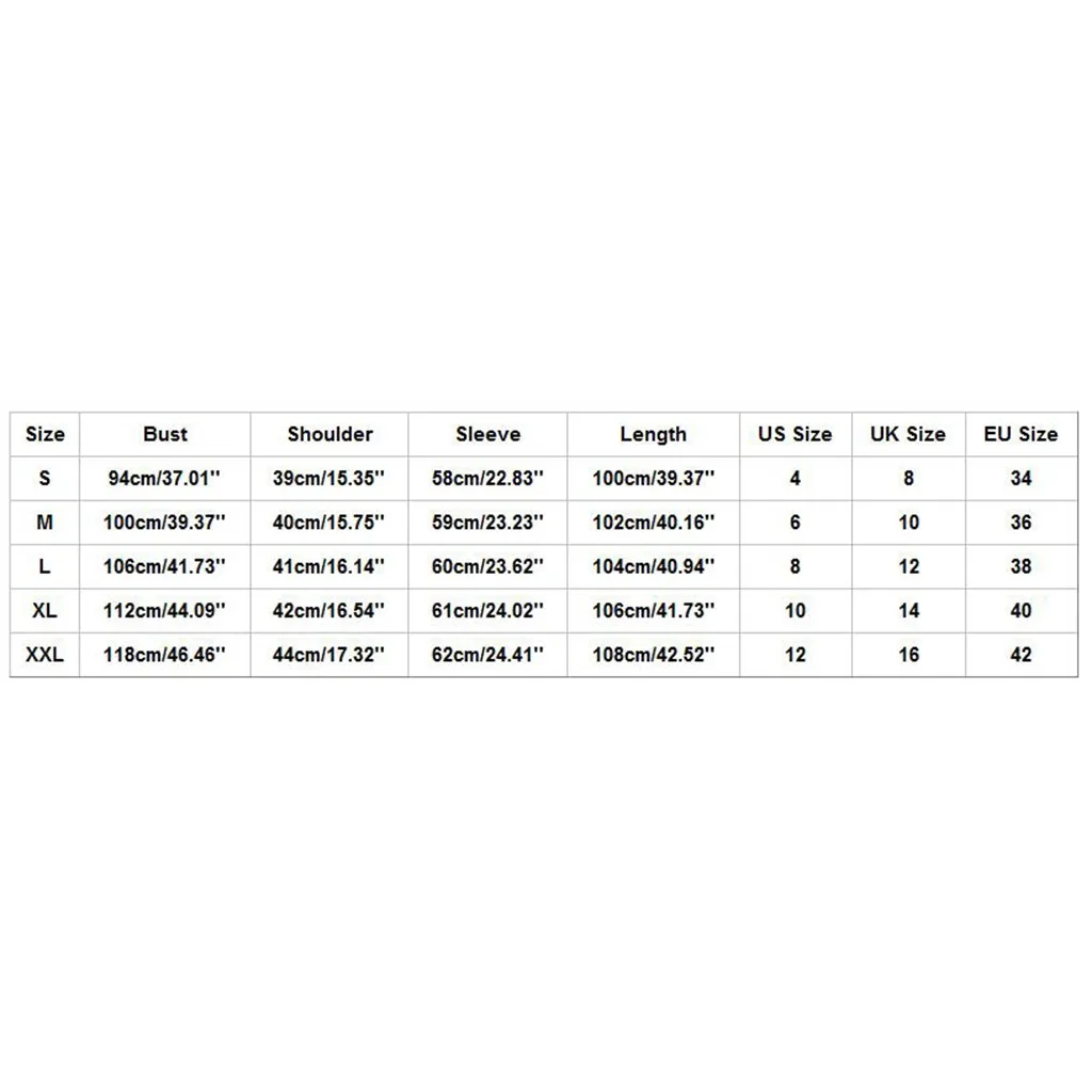 | Size | Bust | Shoulder | Sleeve | Length | US Size | UK Size | EU Size |