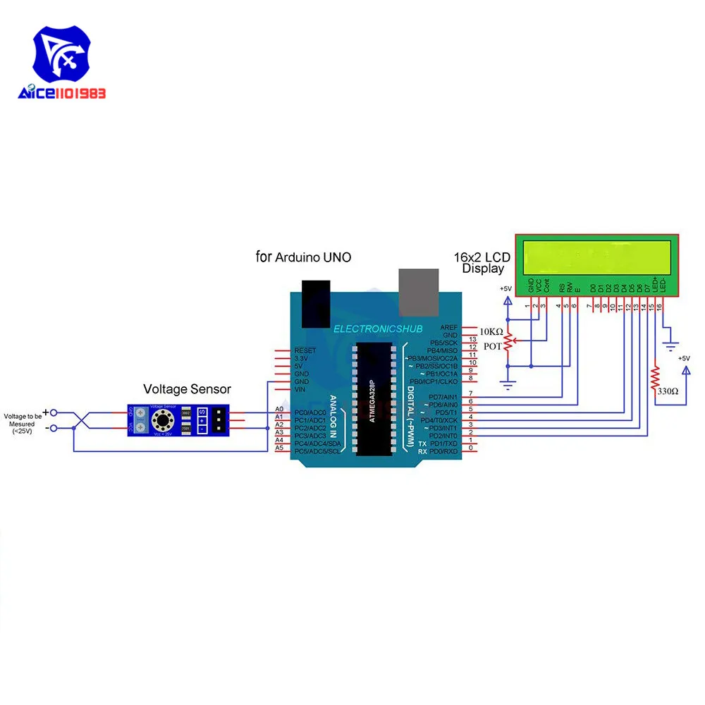 Этот модуль основан на принципе резистивного делителя, что делает входное напряжение терминала интерфейса уменьшенным в 5 раз, для Arduino Аналоговое входное напряжение до 5 В, затем входное напряжение напряжения модуль обнаружения не может быть больше, чем 5V × 5 =, алюминиевая крышка, 25В (в том случае, если используется 3,3 V системы Входное напряжение не может превышать 3.3Vx5 = 16,5 V). Потому что для чипов Arduino AVR используется в 10 AD, поэтому разрешение аналогового модуля составляет 0,00489 в (5 В/1023), таким образом, модуль обнаружения напряжения определяет Минимальное входное напряжение 0,00489 в × 5 = 0,02445 в. Может также использовать IIC LCD 1602 LCD для отображения напряжения.