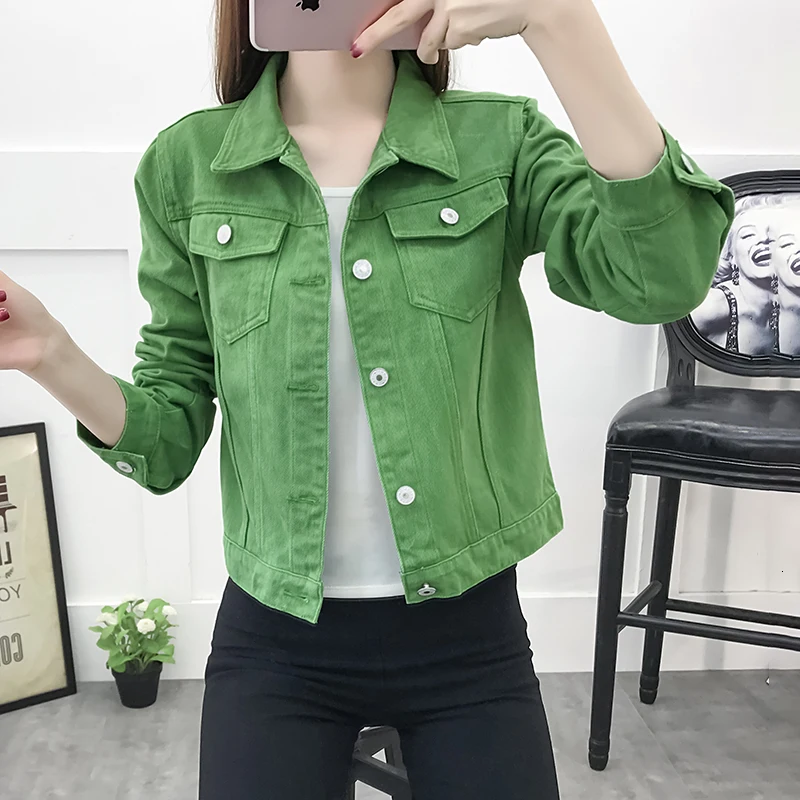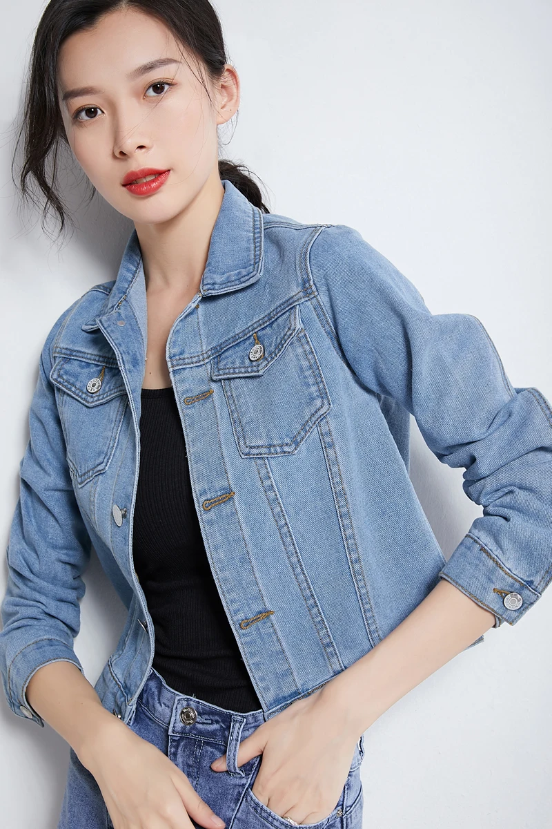Женская джинсовая куртка короткая эластичная с длинными рукавами и кисточками