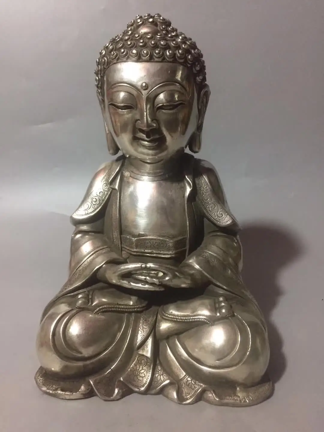 Коллекция китайский Тибетский серебристый резной статуя Будды Шакьямуни медная статуя Saf...