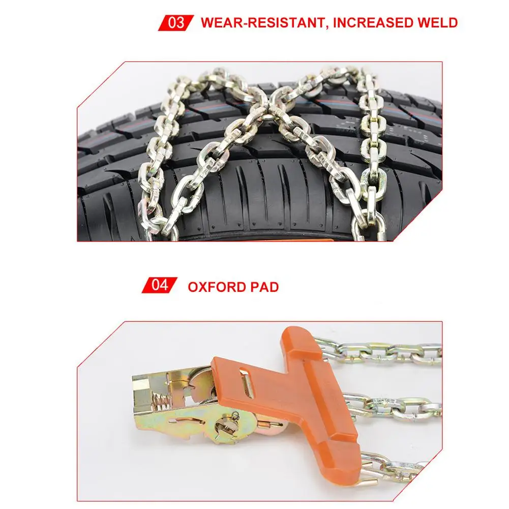 1、High-quality Material: The tire snow chain is made of high-quality steel, which is durable and will not damage the tire, reduce noise, wear, cold and anti-aging to ensure durability and service life.2、Quality Material: The snow chain is made of 100% metal and has a low temperature resistance, so it can withstand temperatures even at minus 60 degrees. This tire chain protects car tires perfectly in any weather.3、Scientific X-chain Design: X-shaped cross-distribution, comprehensively prevent slipping, effectively eliminate snow, enhance anti-slip effect, use triangle stability to make anti-slip effect more stable, with minimum braking distance and maximum traction sliding, provided in bad weather Perfect anti-slip effect for improved safety during travel.4、Easy to Install and Disassemble: The car safety chain is easy to install, no jacks are needed, no tires need to be disassembled, safe to use, and the chain has a simple tensioning strap to easily rescue your vehicle from difficult environments without the need for Pay a higher trailer fee.5、Emergency Road Rescue: Easy to carry and store, maintain good performance around the clock, it is an essential tool for emergency situations such as travel, snow, mud, climb, ice, etc. It is suitable for most pickup trucks, SUVs, trucks, cars, and models.Specification:Name: Car Snow ChainMaterial: steelColor: stainless steelWeight: about 600g / pieceProduct size (approx.): Snow chain: about 34*15cm/13.39*5.91in Nylon rope: about 50cm/19.69inApplicable tire specifications: universalApplicable scene: ice, snow, muddy road, desert, loessNote: 2-5 pieces are recommended for one tire, not for 24V large trucks.Packing List: 2*stainless steel snow chainNote:1. According to different situations, the digital installation is different, such as emergency upgraded.2. You can install two chains depending on the situation.3. Do not put the chain into the hole filled with air. 4. Due to the difference between different monitors, the image may not reflect the actual color of the project.