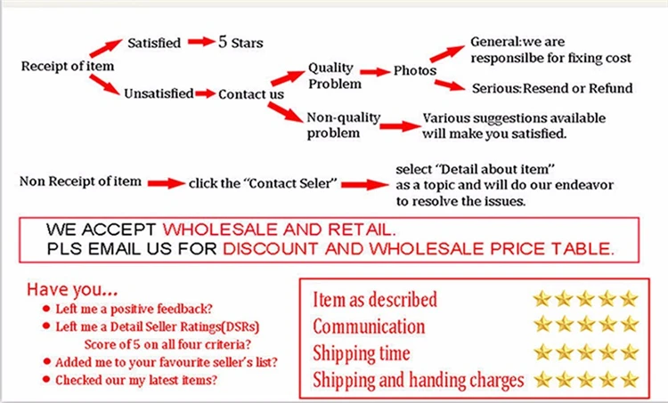 1. Мы зависим от удовлетворенности наших клиентов, чтобы добиться успеха. Мы дорожим каждым клиентом. Поэтому ваши отзывы очень важны для нас. 2. Если вы удовлетворены товарами и нашим обслуживанием, пожалуйста, уделите минуту, чтобы оставить положительный отзывы с 5 звездами, мы с радостью сделаем то же самое для вас. 3. Пожалуйста, свяжитесь с нами, прежде чем оставлять нейтральные (3 звезды) или отрицательные (1-2 звезды) отзывы. Мы постараемся сделать все возможное, чтобы решить проблему и оставить вам счастливое настроение покупок здесь. Спасибо за понимание! Послепродажное обслуживание: 1. Мы будем использовать наш 100% энтузиазм, чтобы удовлетворить визит каждого покупателя. 2. С нашим самым искренним обслуживанием, чтобы обеспечить удовлетворение всех клиентов. 3. Если вы столкнулись с проблемами во время процесса покупки, пожалуйста, свяжитесь с нами.