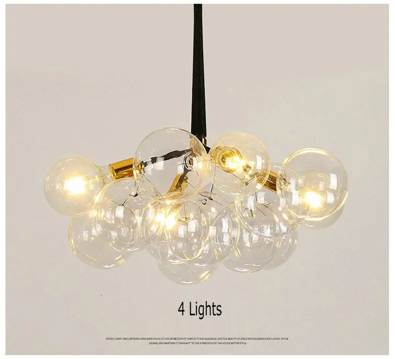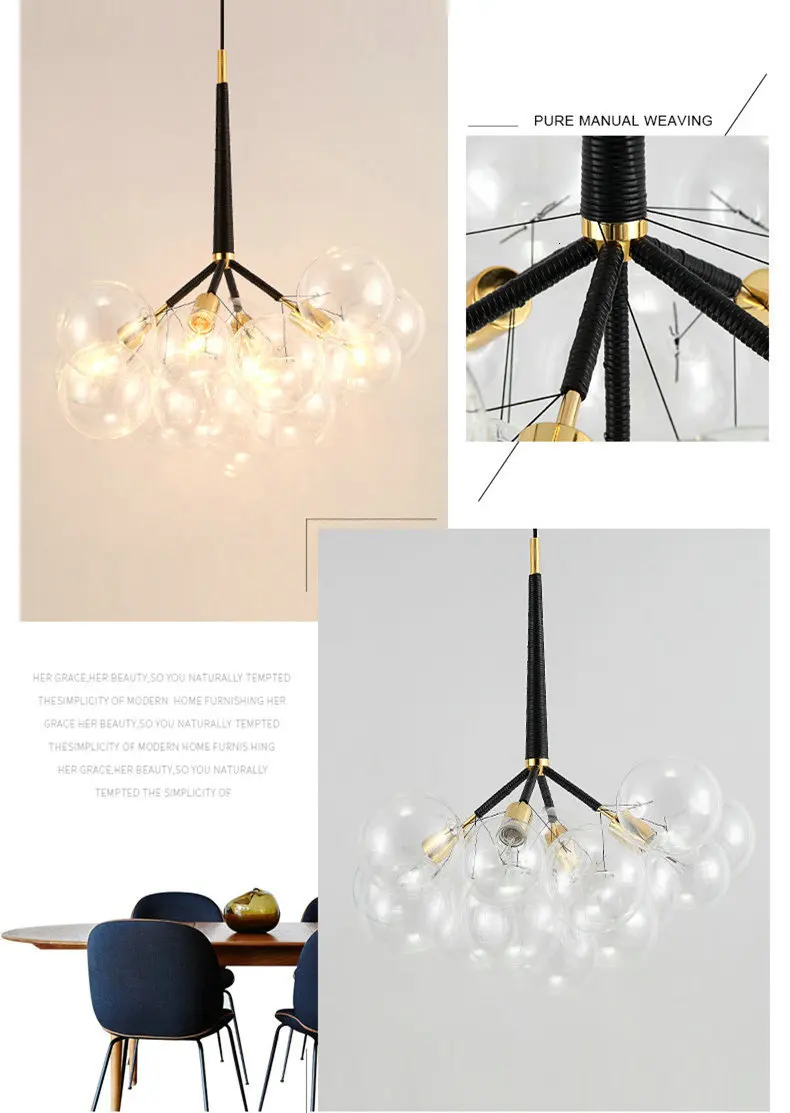 Спецификация: Материалы: металл, стекло, Вход питания: ac220в Источник света: E27 Светодиодный светильник (не входит в комплект) Цвет корпуса: черный или белый, коричневый Размер: 3 лампы: 45 см * 75 см + 50 см 4 лампы: 45 см * 75 см + 50 см 6 ламп: 65 см * 75 см + 50 см Применение: столовая, спальня, гостиная, кабинет, бар, кофейня, ресторан и так далее