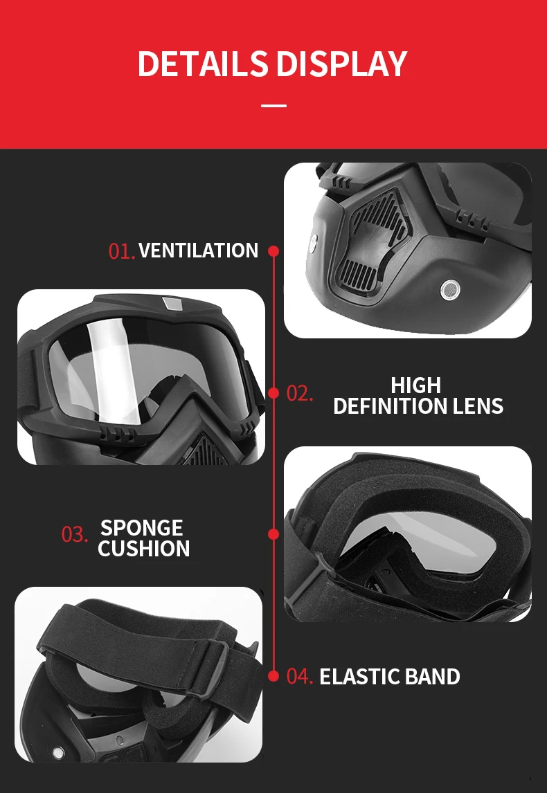 * Съемные очки, фильтрация дыхательных отверстий, пыль, песок, максимально сохраняет дыхание мягким.