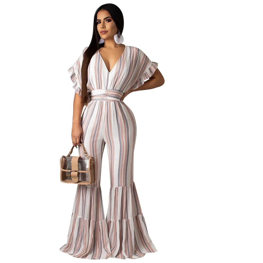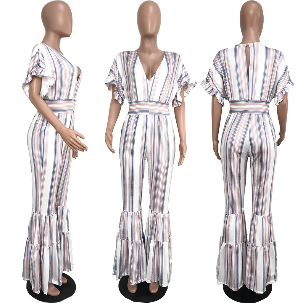 Полосатые обтягивающие сексуальные комбинезоны для женщин с глубоким v-образным вырезом и коротким рукавом с рюшами, Летний Пляжный комбинезон с открытой спиной AE231
