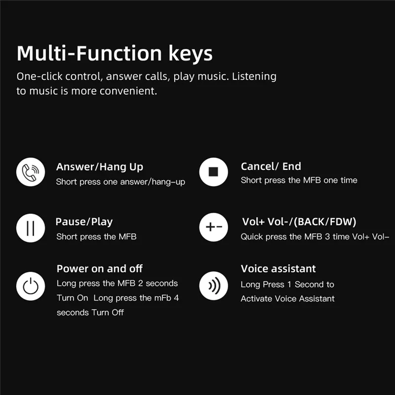 Особенности: Уровень мощности: 2 Микрофон: -42 ± 3 децибел Зарядный входной стандарт: Сенсорная точка, 5 в постоянного тока/0,5a Литиевая батарея: 110 мАч * 2 Время зарядки: около 1,5 часов Время работы: около 10-12 часов Время работы в режиме ожидания: около 220 часов