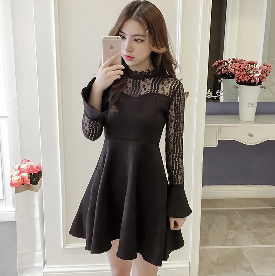 Милые платья; Новинка; Лидер продаж; женское облегающее платье трапециевидной формы с расклешенными рукавами для девочек; маленькое черное платье с вырезом «кроше»; DV533