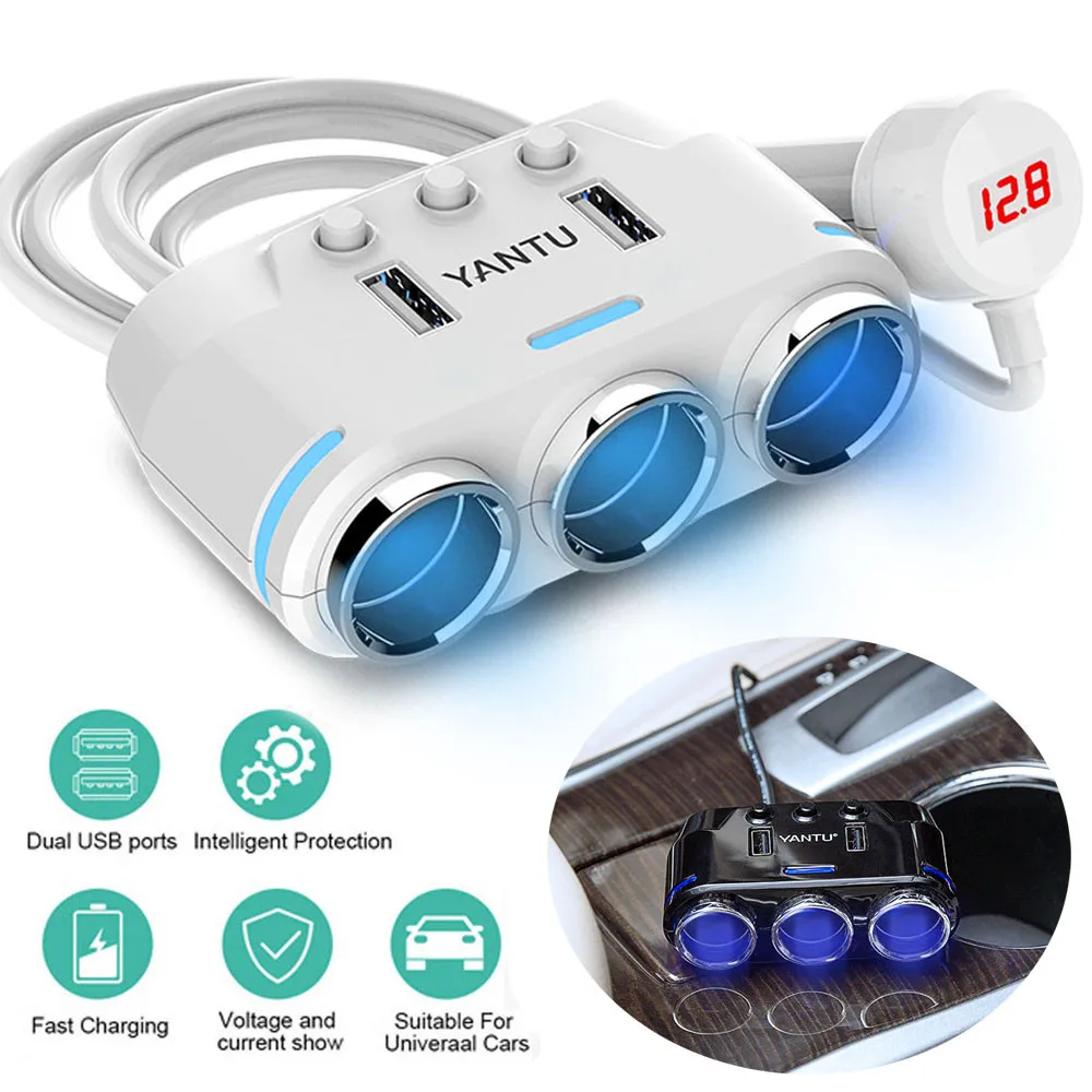 - 1x3 Way Разветвитель Прикуривателя 2 зарядных порта USB для автомобиля Зарядное устройство