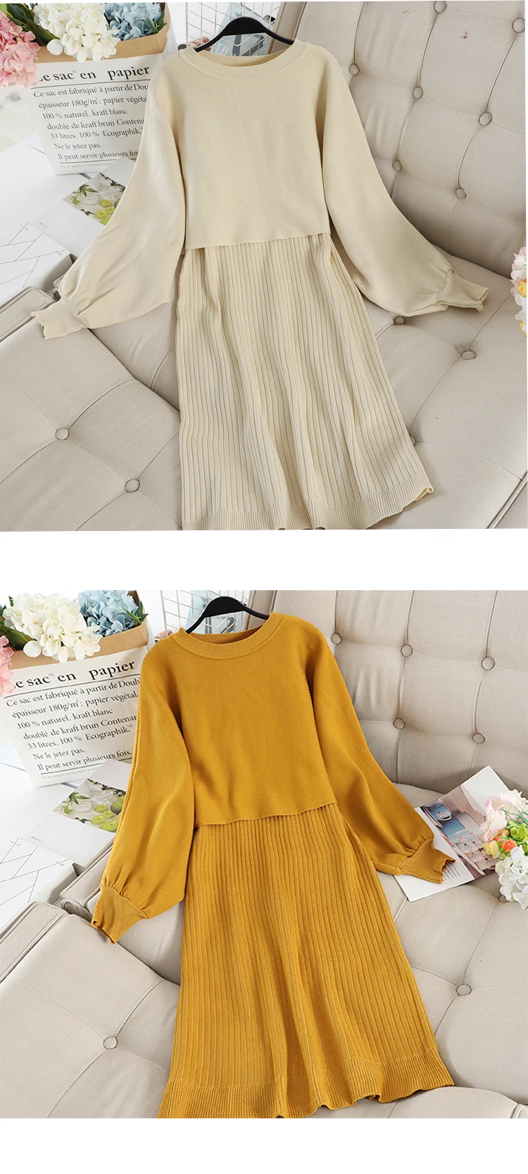 Свитер: обхват груди: эластичный Длина рукава: 59 см длина: 38 см Платье: обхват груди: 80 + см длина: 95 см
