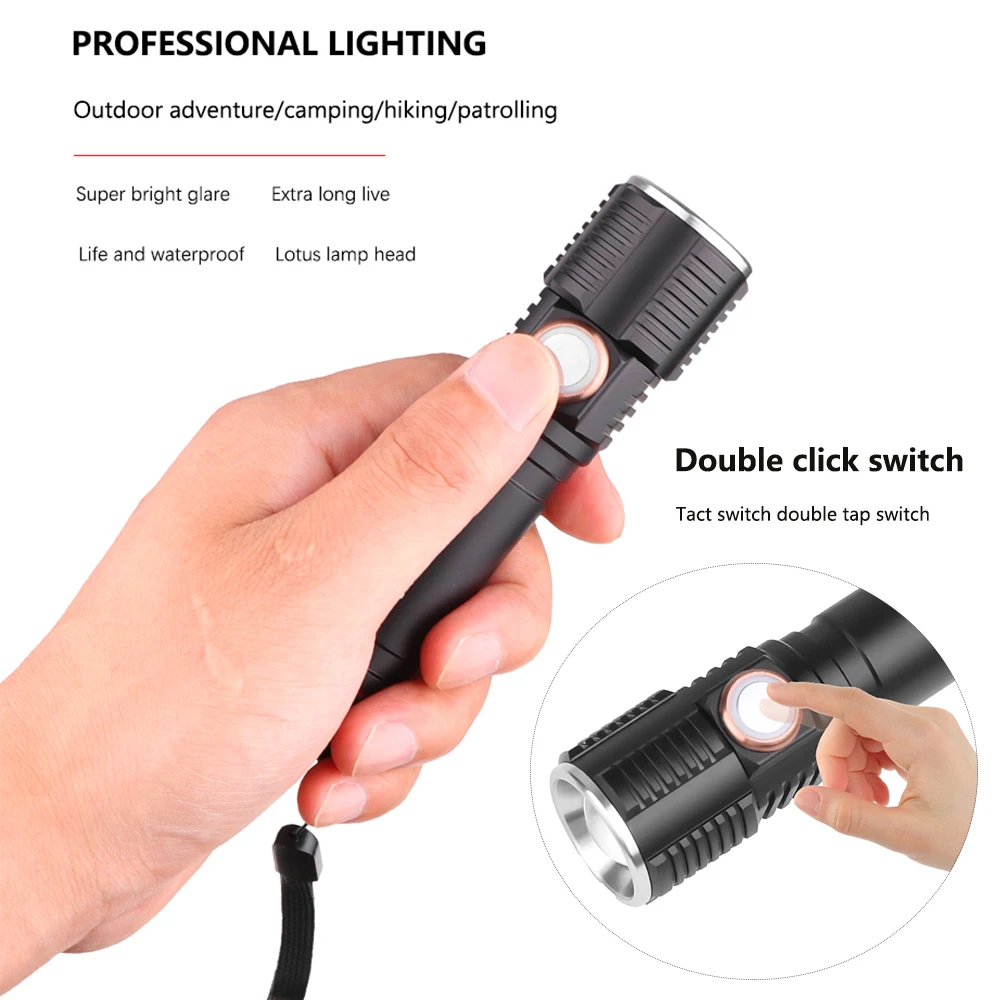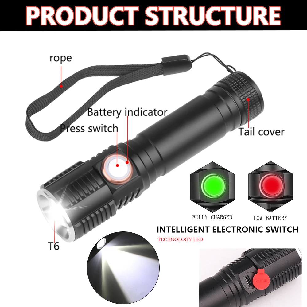 Самый мощный фонарик с подзарядкой от USB, супер яркий фонарь, светодиодный фонарик с зумом, водонепроницаемый фонарь с 18650 батареей