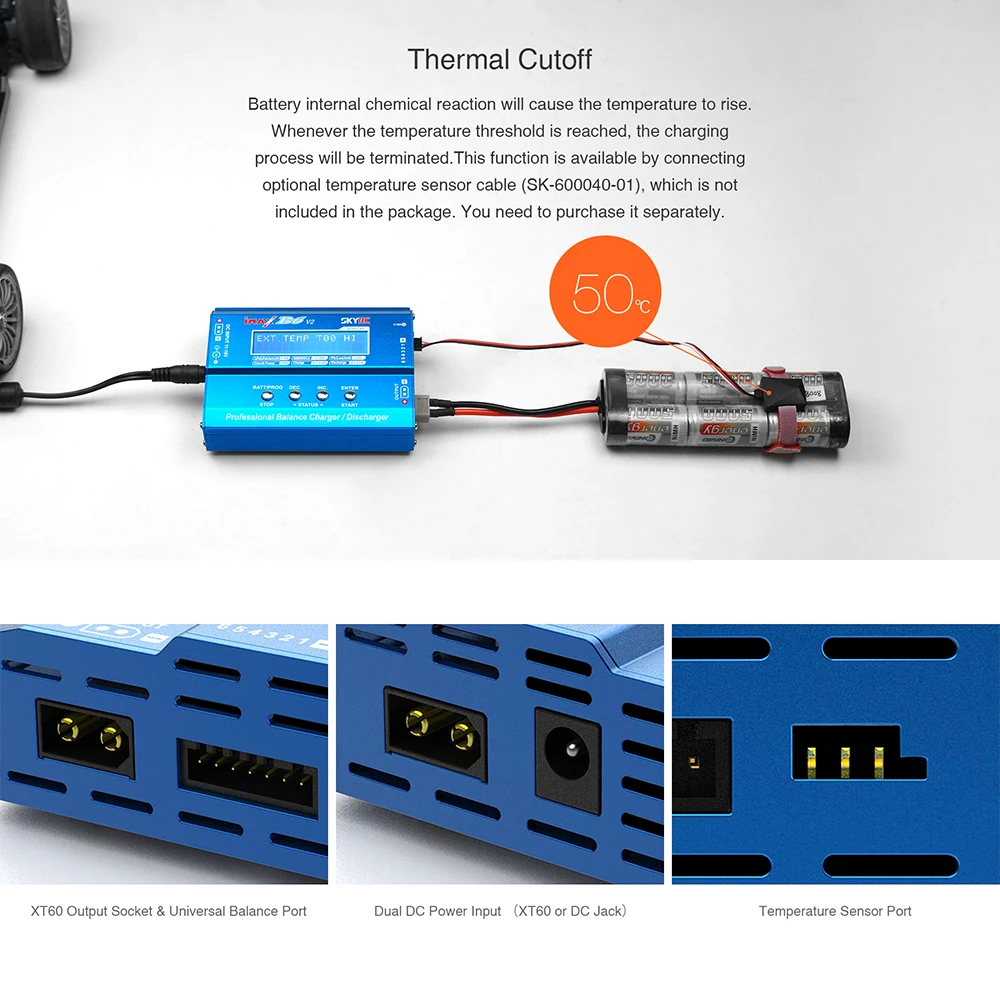 Термальность среза:Внутренняя химическая реакция батареи вызовет рост температуры до порогового значения, процесс зарядки будет закончен. Эта функция доступна при подключении кабеля с опциональным датчиком температуры (SK-600040-01), который не входит в посылка. Вам нужно приобрести его отдельно.