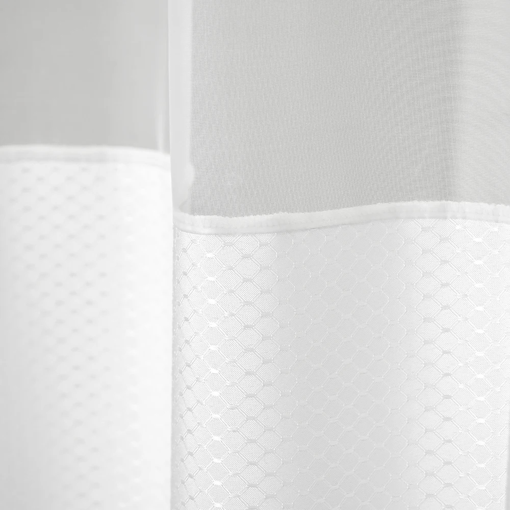 Белая занавеска для душа изготовлена из 100% полиэстера с белой марлей. Машинная стирка и легко моется