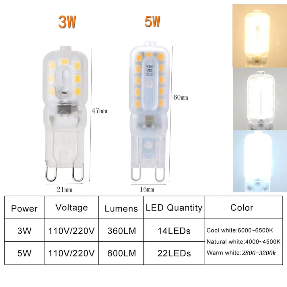 Цвет: теплый белый/нейтральный белый/холодный белый Напряжение: 110 В/220 В С регулируемой яркостью или нет: с регулируемой яркостью Мощность: 3 Вт/5 Вт Светодиодный чип-Модель: SMD 2835 Тип розетки: G9 Угол освещения: 360