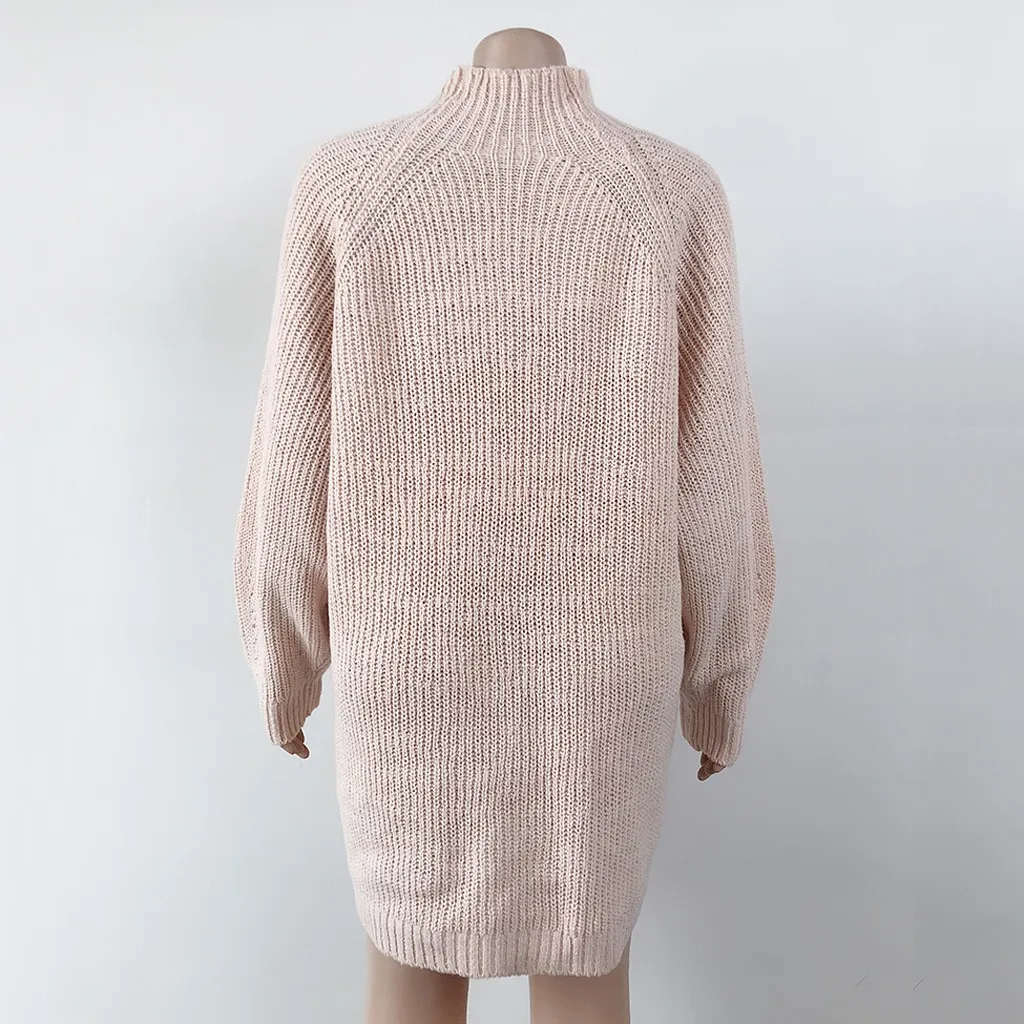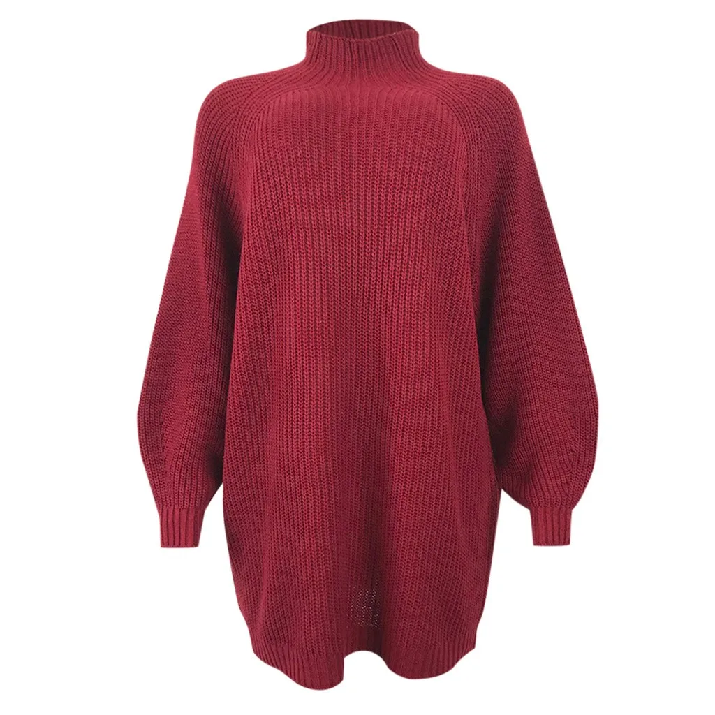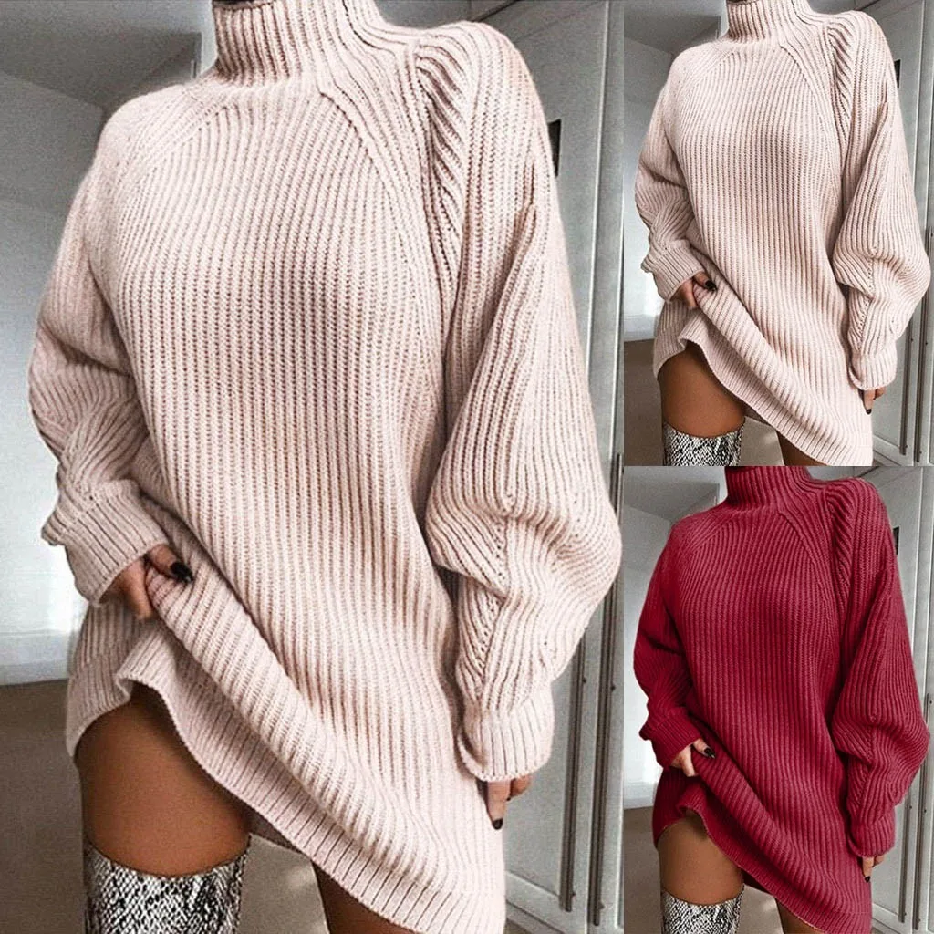 Мода женщин сплошной длинный рукав водолазка зима свободный пуловер свитер платье