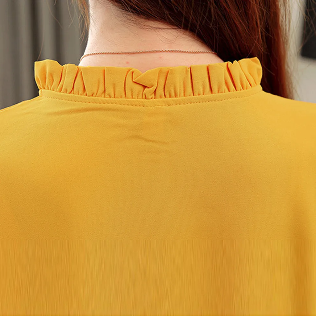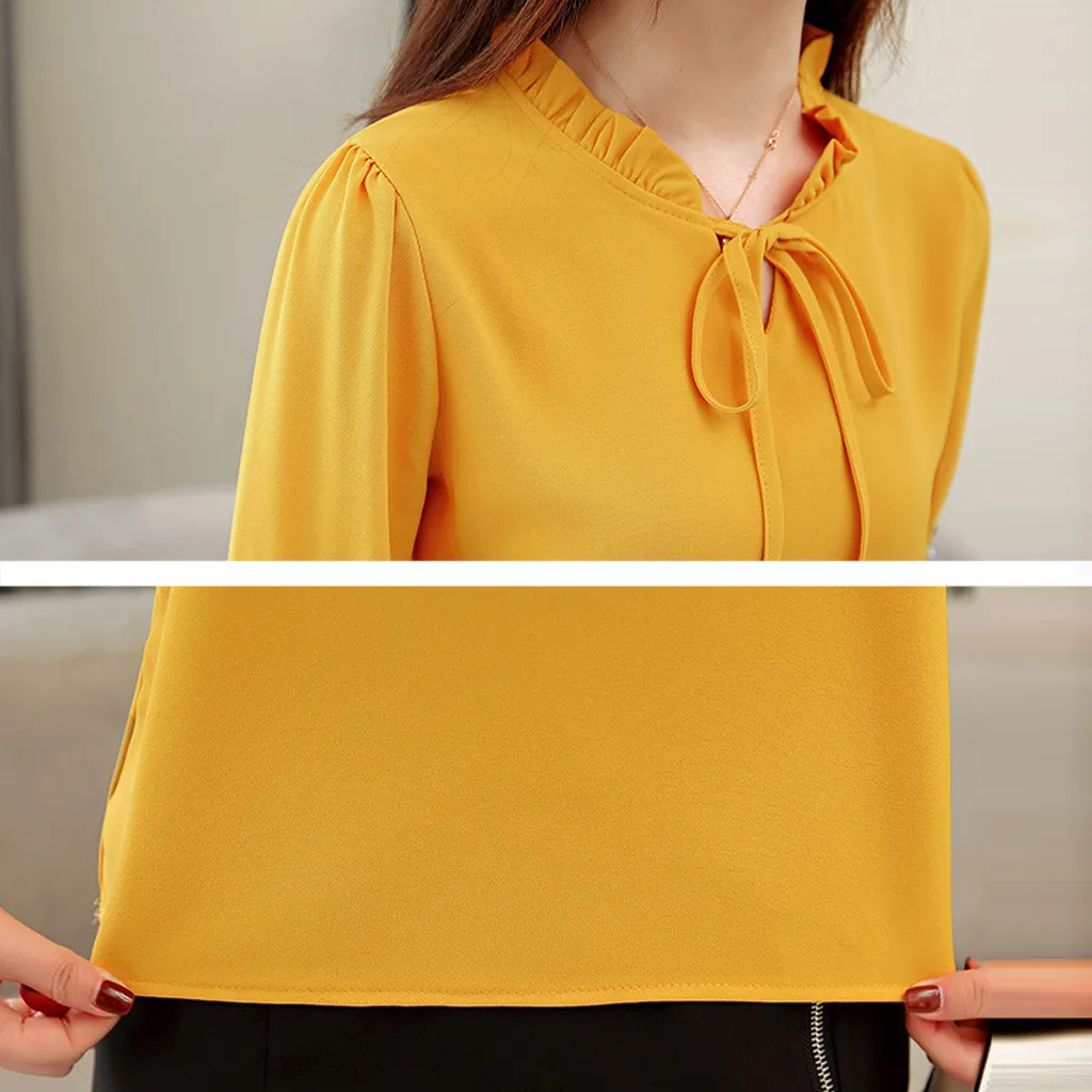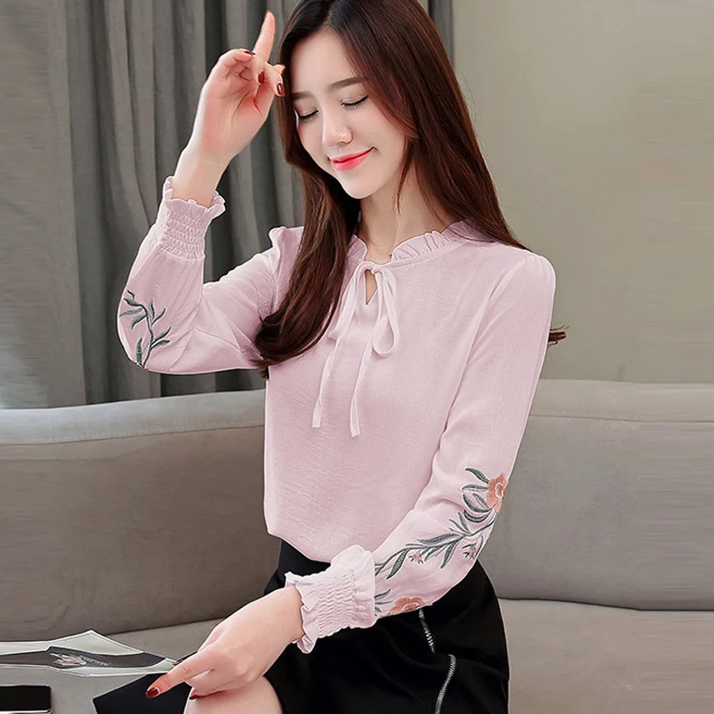 Шифон женщин с длинным рукавом вышивка v-образным вырезом повседневные топы галстук-бабочка рубашка